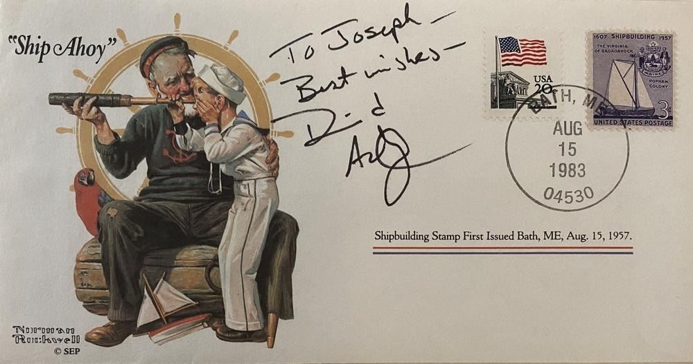 David Ackroyd signed Shipbuilding Stamo First Issued Bath, ME. August 15, 1983. 7x4 inches