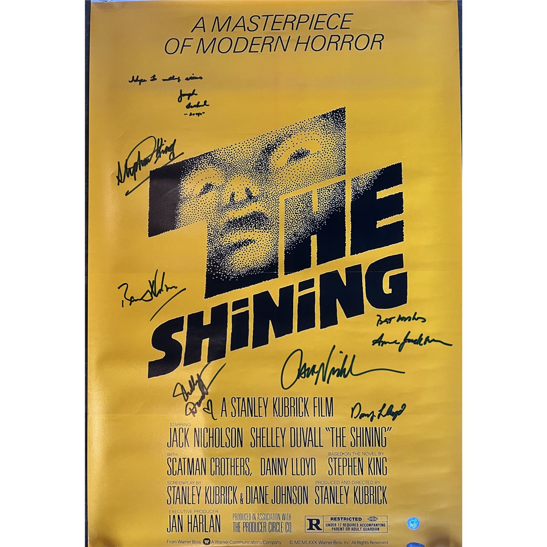 The Shining cast signed movie poster autographed by Jack Nicholson, Shelley Duvall, Danny Lloyd, Anne Jackson, Joe Turkel Barry Nelson, and Stephen King. GFA authenticated. 24x37 inches