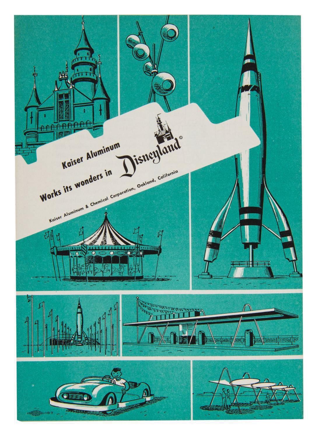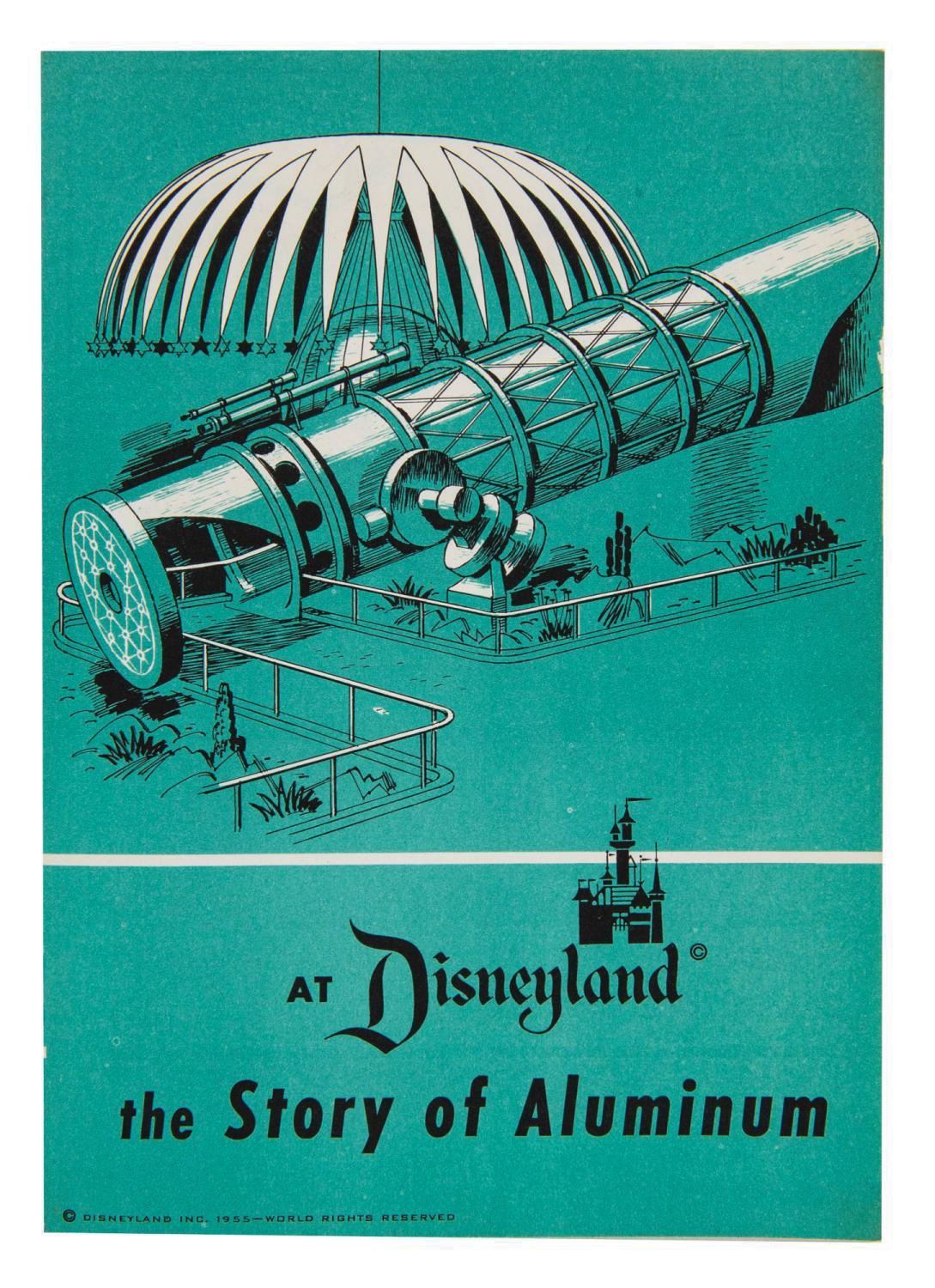 (Disneyland, 1955) A "The Story of Aluminum" souvenir booklet for Kaiser Aluminum's exhibit in Tomorrowland. The souvenir features a two-tone map of the Tomorrowland exhibit, and describes "How Aluminum is Made," as well as the characteristics, industrial applications, and household uses for the namesake metal. This 14-page booklet measures 7.5"x5.25" and is in fine condition.