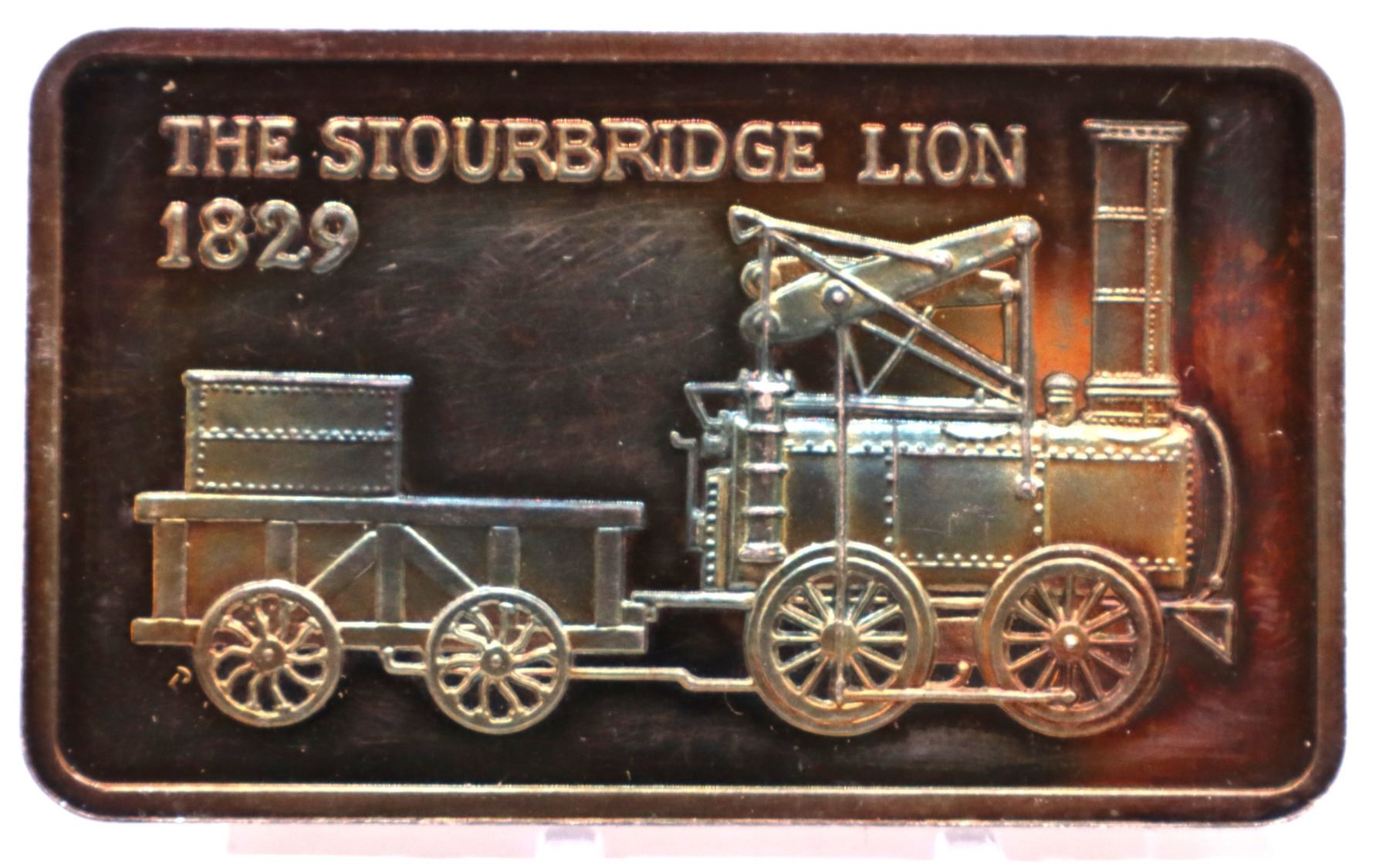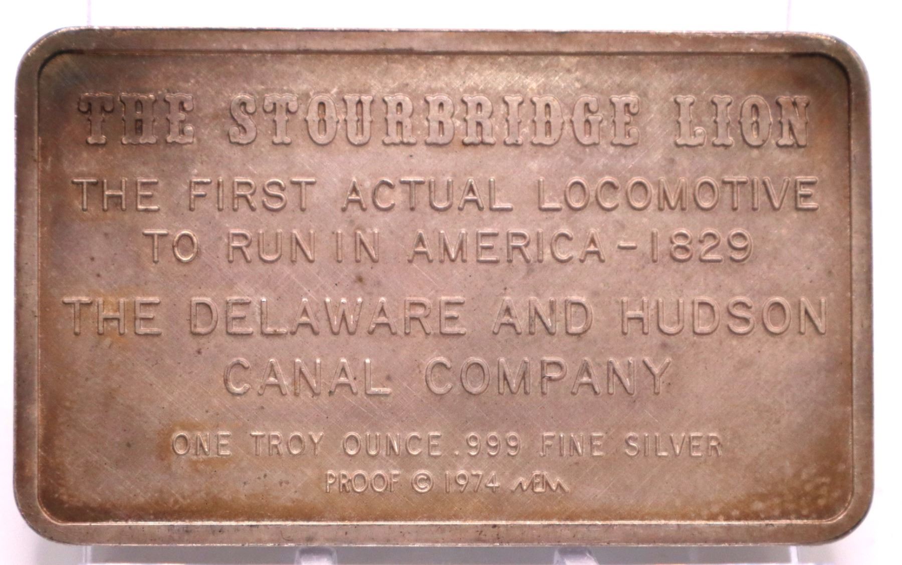 The Stourbridge Lion 1829 1oz proof silver art bar. Nice toning. Hard to see on photo. (tax exempt)