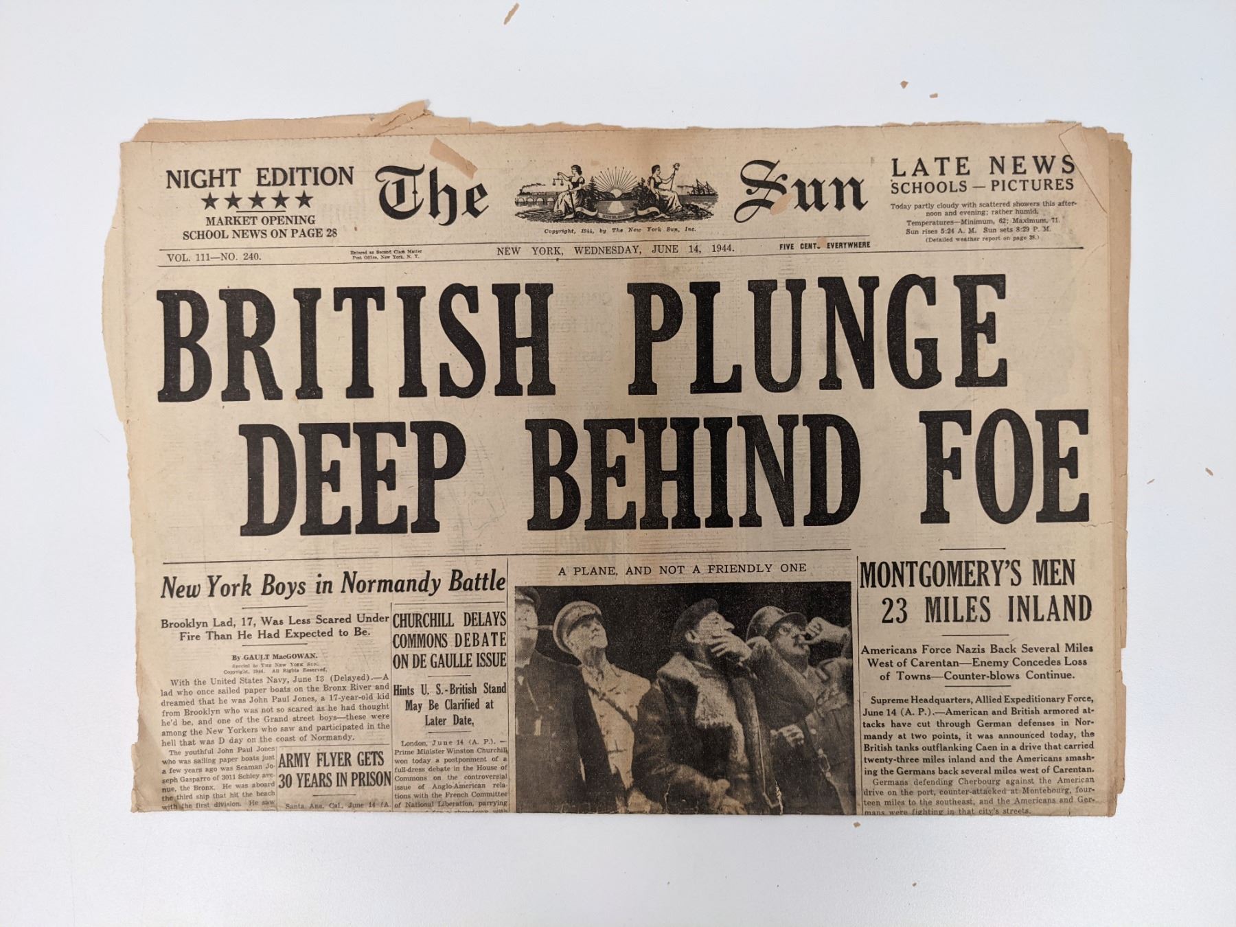 The Sun 1944 Vintage Newspaper. Jun 14 1944. British Plunge Deep Behind Foe. 11x17 inches