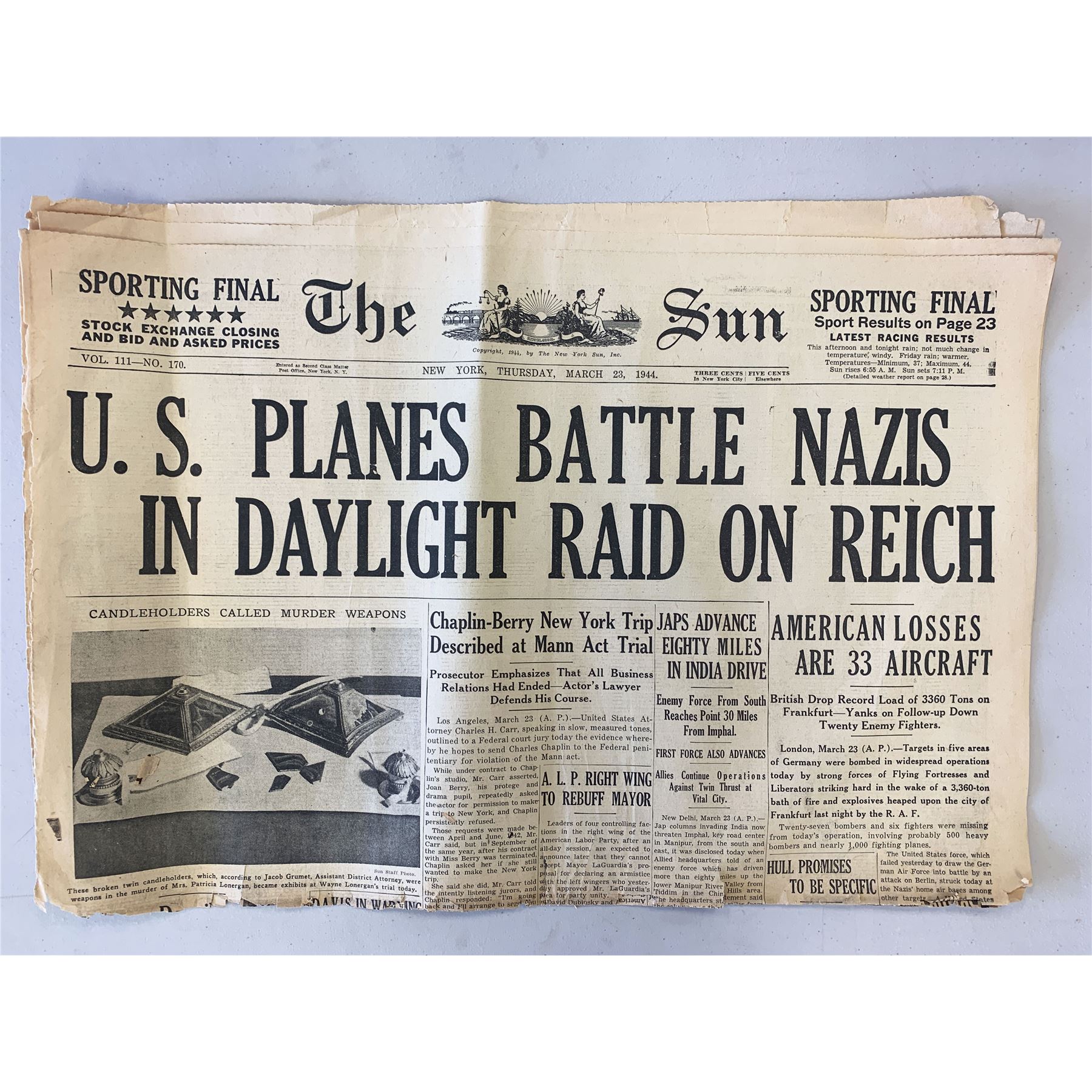 The Sun Original Vintage Newspaper - Thursday March 23rd 1944 - US Planes Battle Nazis. Includes Wear and Tear. Not For Reading. 11x17 inches