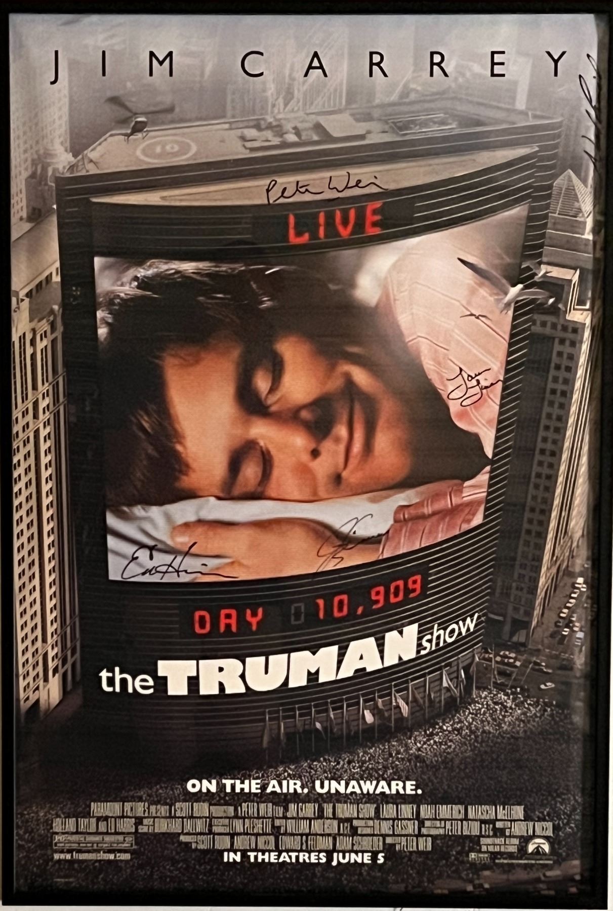 The Truman Show cast signed poster autographed by Jim Carrey, Laura Linney and Ed Harris. Custom framed 28x42 inches This item is part of an exclusive collection obtained from an executive at Paramount Pictures.