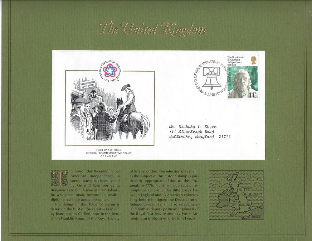 The United Kingdom - American Bicentennial Commemorative FDC - 2 June 76 - The United Kingdom has commemorated the Bicentennial of American Independence with the issuing of a Special Commemorative Stamp on a Limited Edition First Day Cover