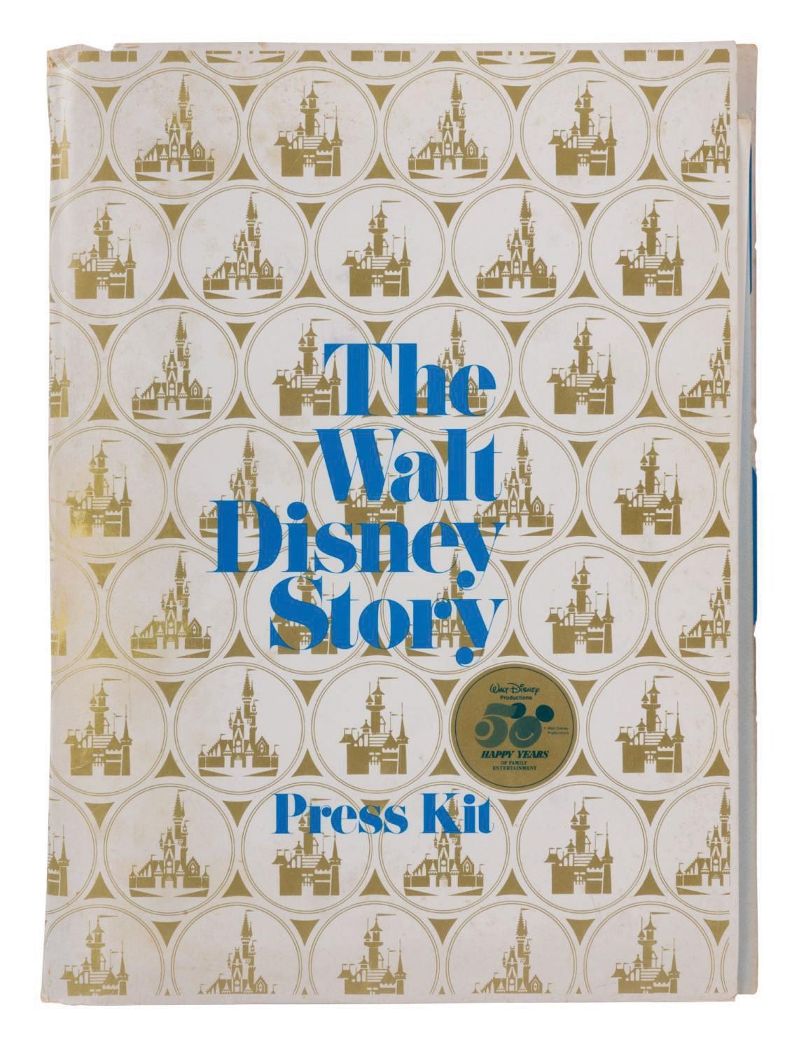 (Disneyland, 1973) A "The Walt Disney Story" press kit prepared for the celebration of "50 Happy Years of Family Entertainment" by Walt Disney Productions. Included among the contents are: a 3-page "Disneyland Honors Its Creator" press release, (3) press release photos, and a 29-page spiral bound The Walt Disney Story document. Contained within their 12"x9" folder, the press kit is in good condition, with moderate wear to the folder spine, and minor creases, folds, and wear to the contents.