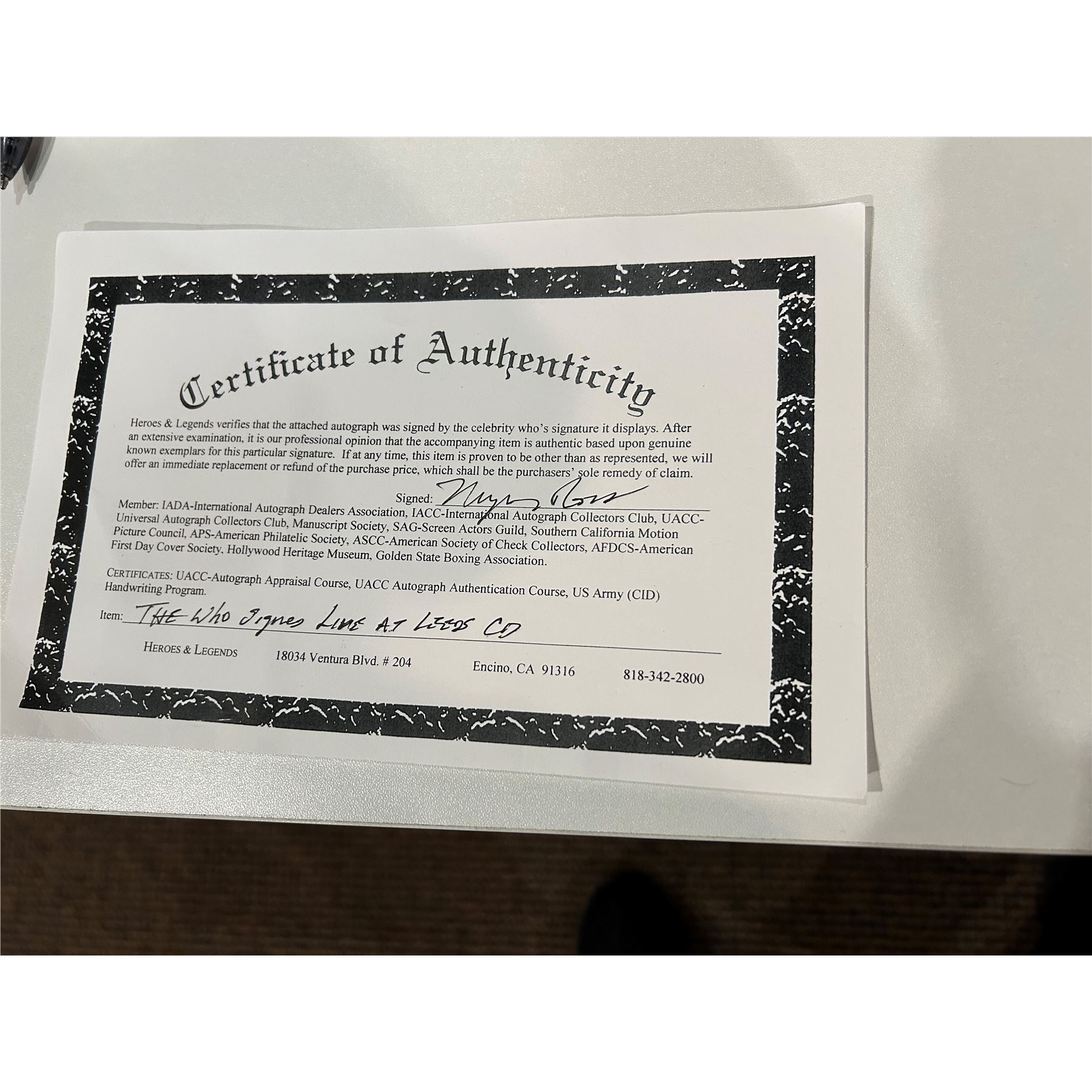 Autographs are certified by a 20 year plus member of IADA (International Autograph Dealers Association) , UACC (Universal Autograph Collectors Club), IACC - International Autograph Collector Club), Manuscript Society, SAG (Screen Actors Guild), Southern California Motion Picture Council, APS (American Philatelic Society), ASCC (American Society Of Check Collectors), AFDCS (American First Day Cover Society), Hollywood Heritage Museum, and the Golden State Boxing Association. Additionally a memb