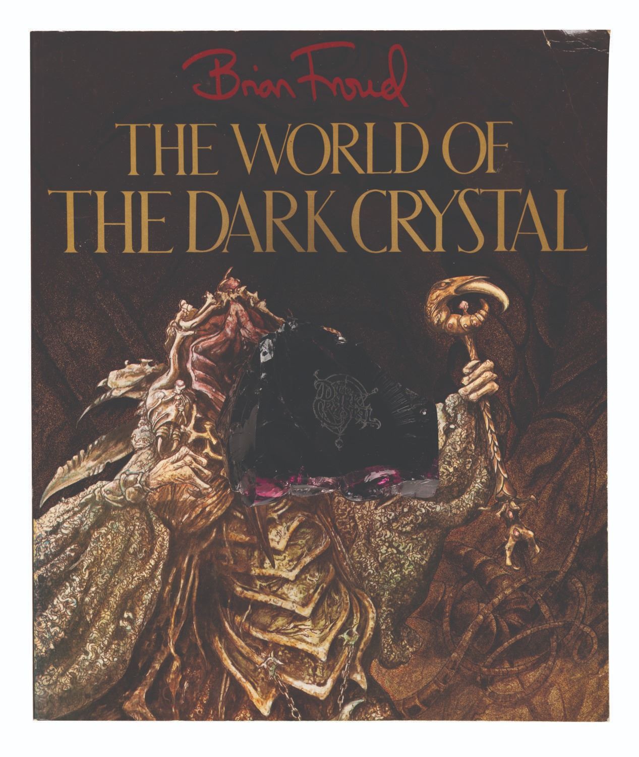 (Universal/Henson, 1982) A The World of The Dark Crystal book and a glass "The Dark Crystal” paperweight resembling a fragment of the gem. The rare softcover book features the artwork of Brian Froud, the film’s concept artist, as well as an in-depth look at the creation of the cult classic. Measuring 11” x 13.25” and 4” x 3.5” x 3” tall, the book and paperweight are in fair to good condition with heavy creases to the book cover, scratches, scuffs, and wear.