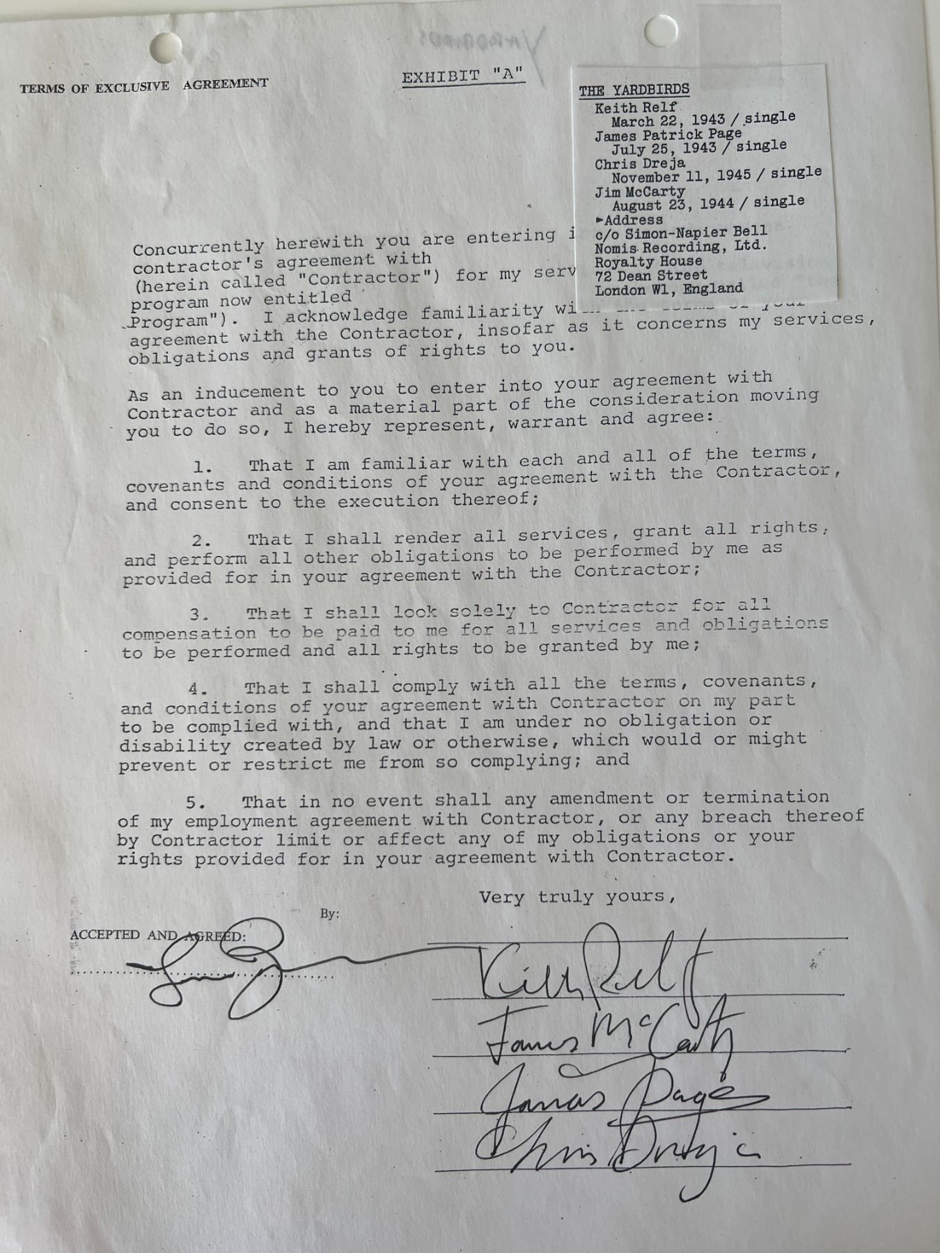 The Yardbirds signed contract autographed by Keith Relf, Jimmy Page, Chris Dreja, and Jim McCarty. 9x12 inches