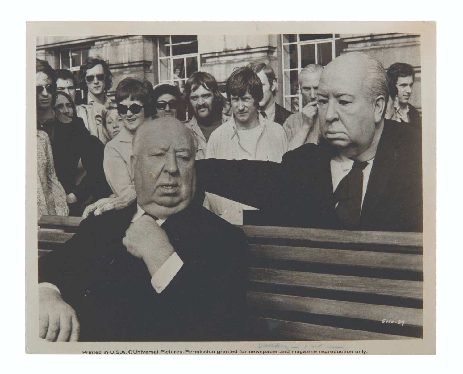 (Universal, 1956-72) Three publicity photos of Alfred Hitchcock for his films, "The Wrong Man,” "The Birds,” and "Frenzy.” Measuring 8” x 10.25”, the photos are in good to very good condition with light edge wear and creasing, a pen inscription on one, and adhesive residue on the "Frenzy” photo.