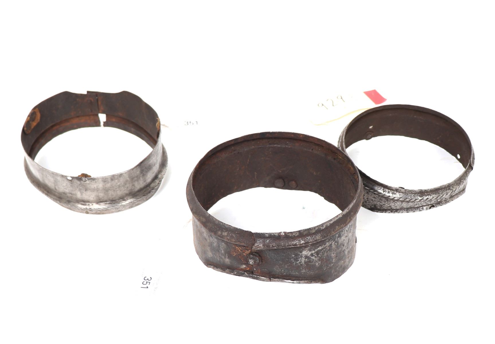 Nice group of three elements of armour for the oscillating components of the upper cannons. Left most a single sheet of steel embossed with a roped section for the insertion of a lower lame to allow the movement of an arm while wearing armour, 16th-17th century. Center a large oscillating component of the arm defenses again with a simple embossed section and riveted together from a single lame, 16th - 17th century. Right most a single element of armour for the upper cannons with a roped embossed decoration riveted together from a single lame, Higgins Armory Museum Inv# (929.36). The right most with a nice fleur de Lis protruding locking component to secure pauldrons. Size 5 3/8" W largest piece. Condition: Remnants of leather and wear throughout commensurate with age and use.. Provenance: Ex-Southern California Collection, Ex-London Sale, Ex-John Woodman Higgins Armory Museum