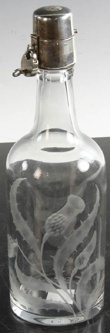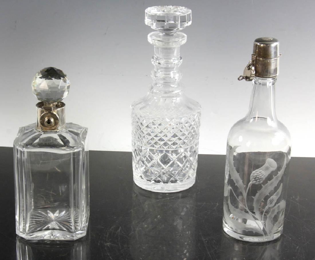 Three glass decanters to include: one signed Hawkes with etched thistle design, sterling top and original lock and key; an English facet-cut bottle with sterling collar and lock, no key; a mold-blown bottle with large disc stopper, tallest decanter measures 11 1/2" H. Provenance: Broomfield, Colorado estate.