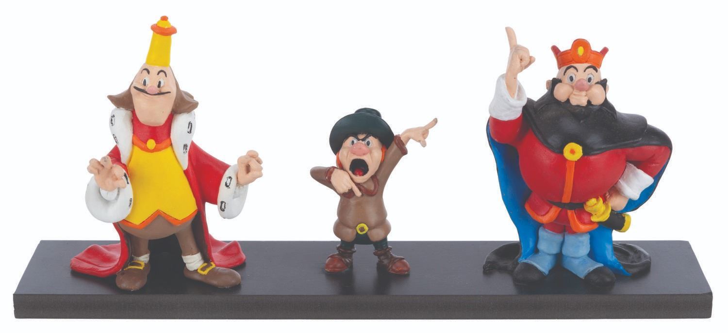 (Fleischer, 1990s) Three reproduction maquettes of King Little, Gabby, and King Bombo from "Gulliver’s Travels,” the first full-length feature film from Fleischer Studios, and the second full-length feature after Walt Disney’s "Snow White and the Seven Dwarfs.” These maquettes were made by an animator who sold only a small handful. Mounted to a base measuring 12.25” x 2.5” x 0.5” tall, and ranging in size from 2.75” x 1.5” x 1.5” deep to 4.75” x 3” x 2.5” deep, the maquettes are in very good condition with a crack to Gabby’s left index finger and a crack to King Bombo’s right wrist.