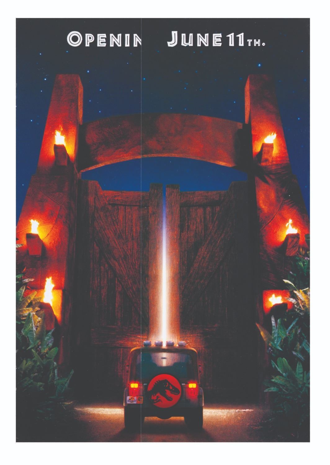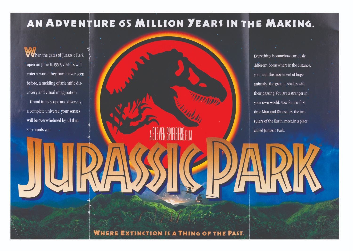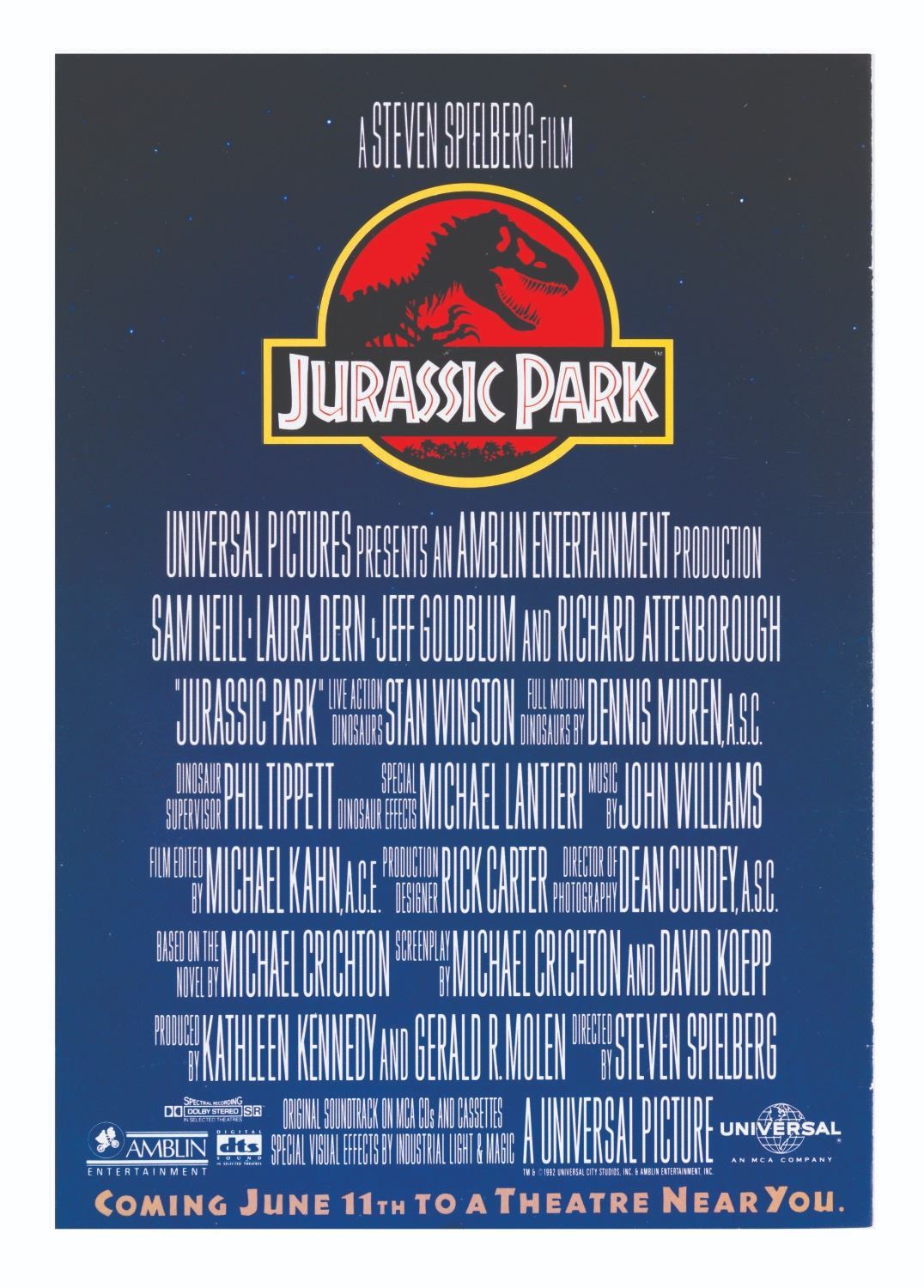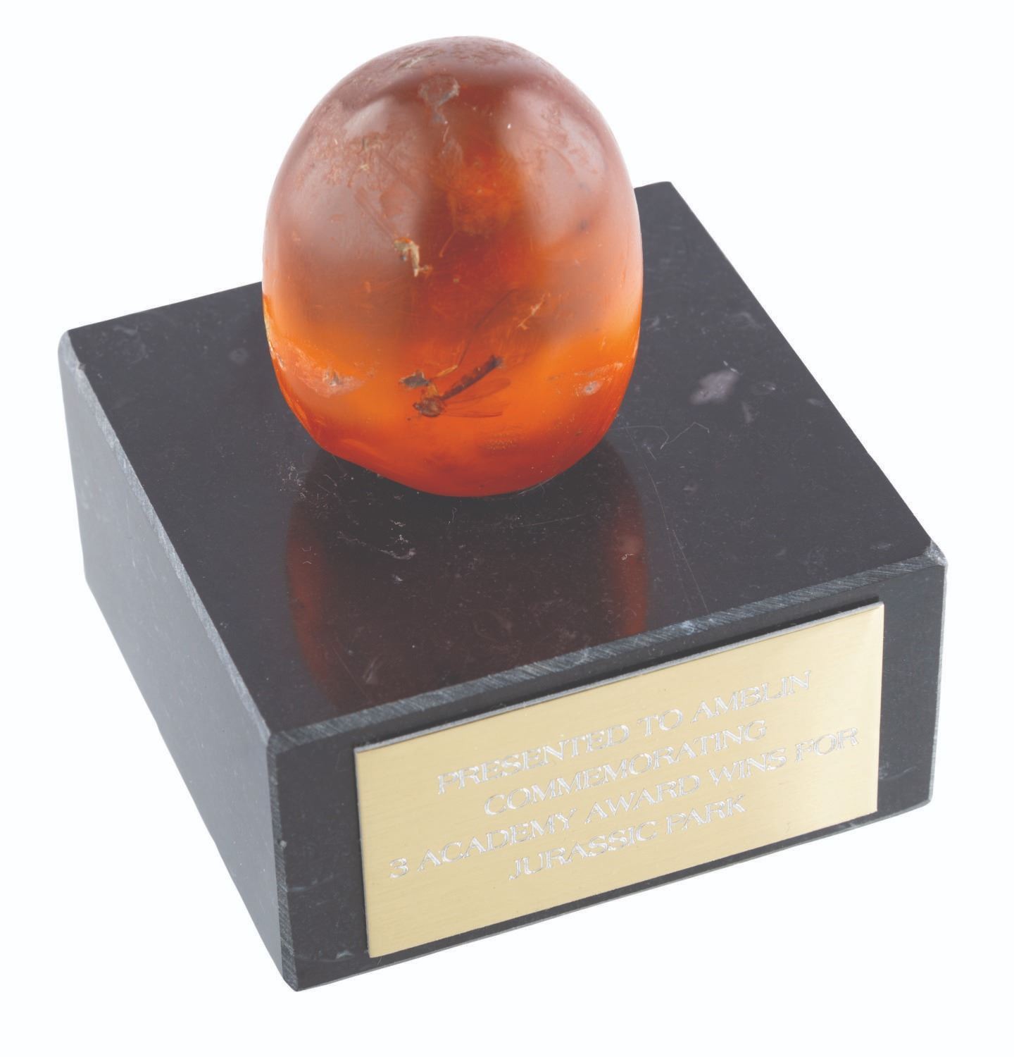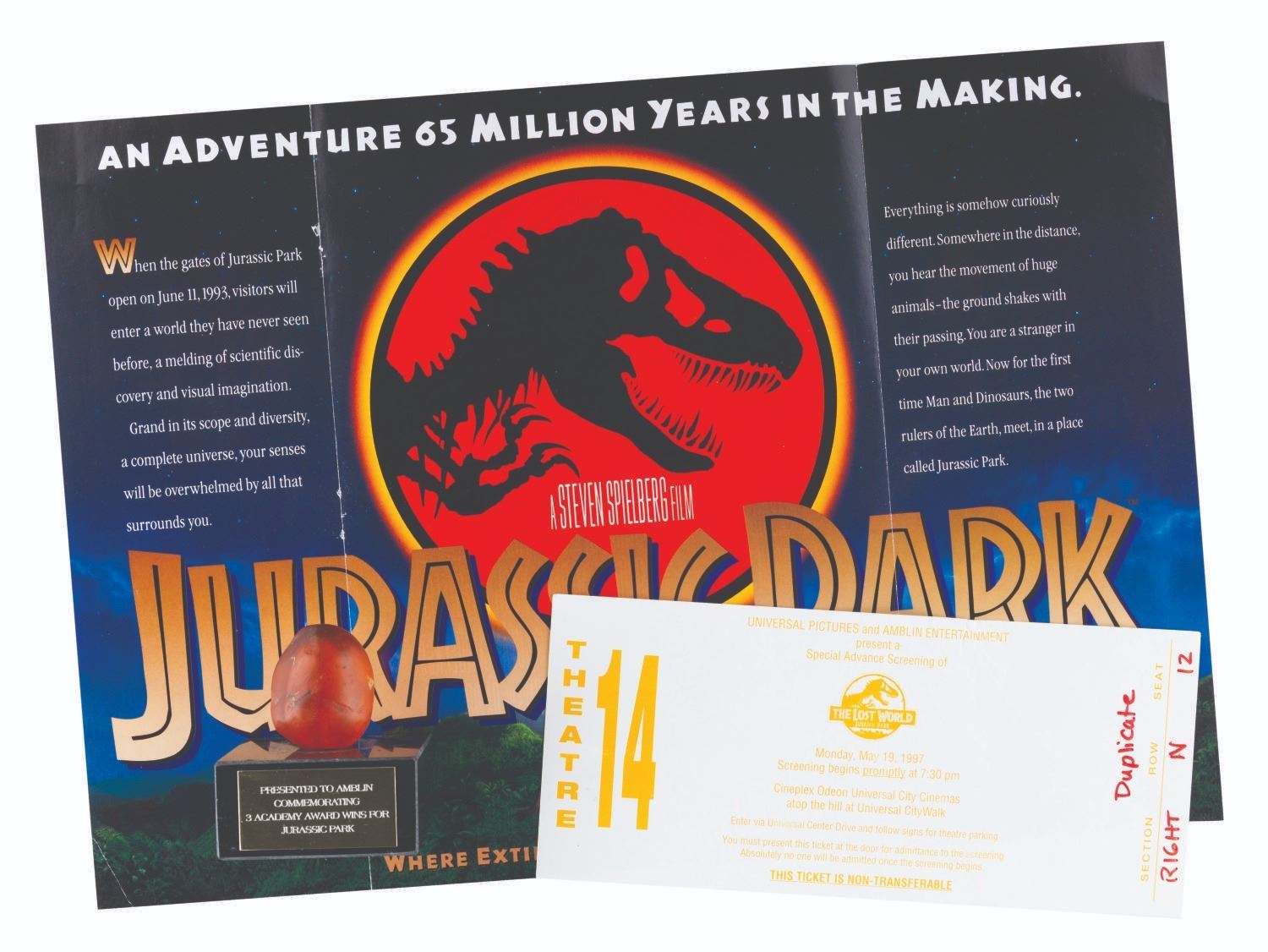 (Universal, 1993-94) Three crew souvenirs from "Jurassic Park,” including an invitation to a special advance screening, a fold-out advertisement, and an amber desk paperweight with a plaque commemorating the film’s three Academy Award wins. Ranging in size from the 2.75” x 2.75” x 2.75” award to the 7.5” x 11” ad, the items are in fair to good condition with scuffs, scratches, creases, wear, and red marker inscriptions on the ticket.