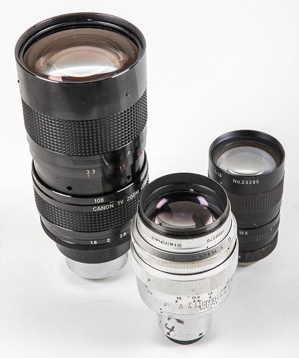 Three Larger Size Lenses. One by Cannon, TV Zoom lens (V6x18, 18-108mm, f1:1.6) in box, one Steinheil lens (1:1,5, f=75mm), one Cosmicar TV Zoom lens (12.5 - 75mm, 1:1.8, no.23285). The Cannon lens appears new; the other 2 are used but appear to be in good working condition. A good chance to add to your collection.