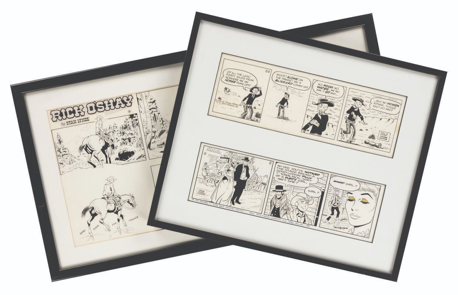 (Lynde, 1959-72) Three original hand-drawn "Rick O’Shay” comic strips by Stan Lynde. Included are two daily strips originally published February 6, 1959, and November 17, 1972, signed in blue ink with a dedication, and a Sunday strip published March 7, 1965. Accomplished in ink, graphite, and Zip-A-Tone, the dailies measuring 5.5” x 16” each and the Sunday strip measuring 12.5” x 27.25” are all in fine condition. The comic strips are presented in matted frames measuring 19” x 22.5” and 18” x 32.75” and are in very good condition with light scuffs and chips to the molding.
