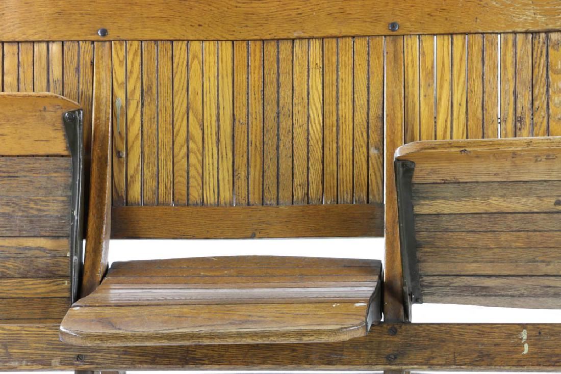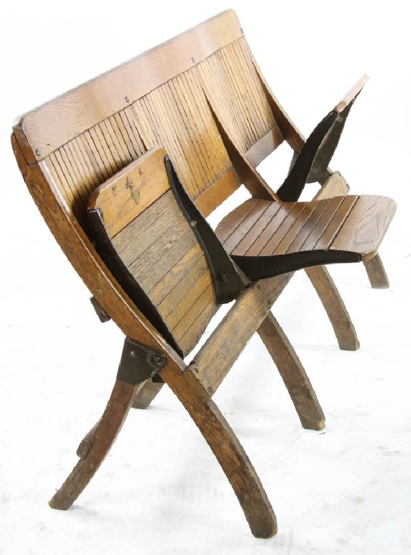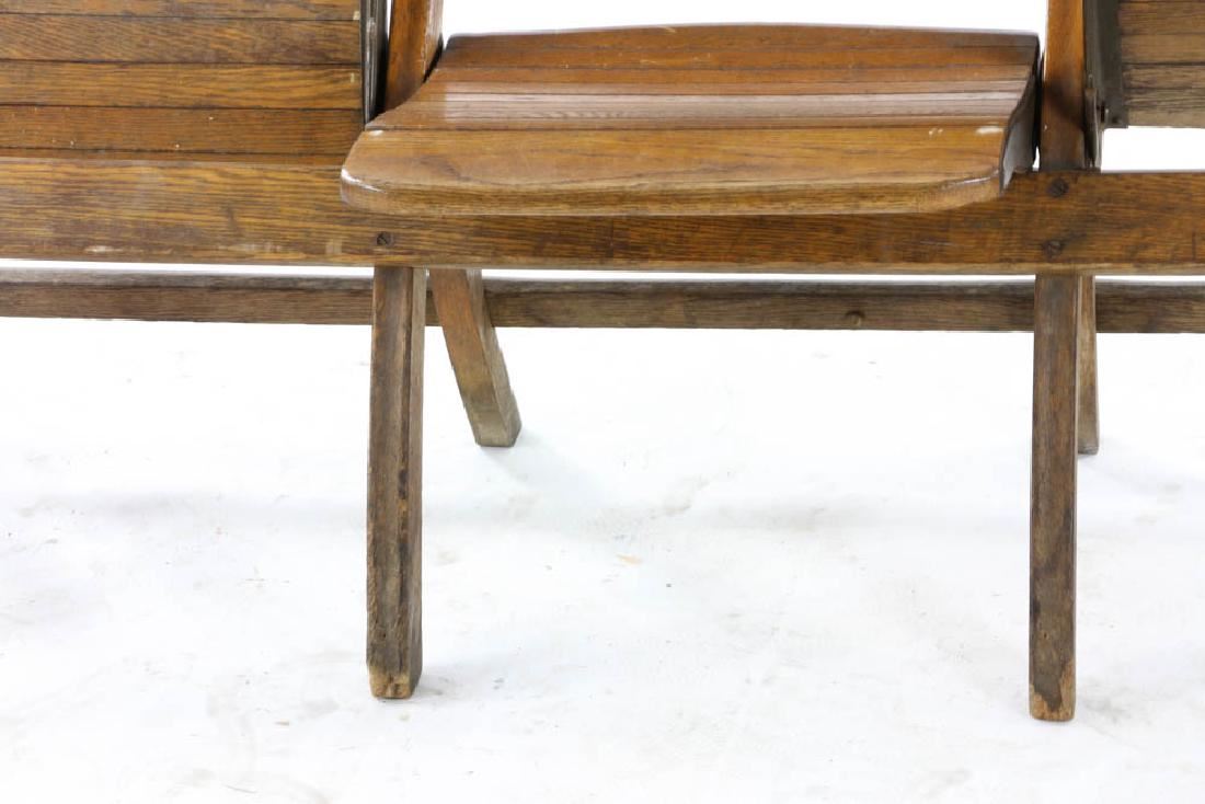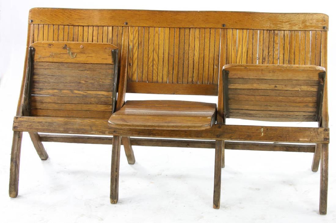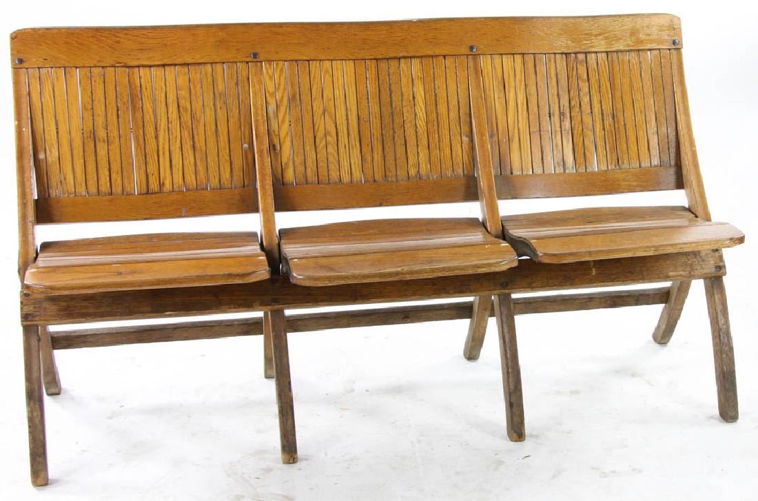 Three-seat oak folding bench, 30 1/2" H x 55 1/4" W x approximately 23" D. Provenance: West Palm Beach, Florida estate.