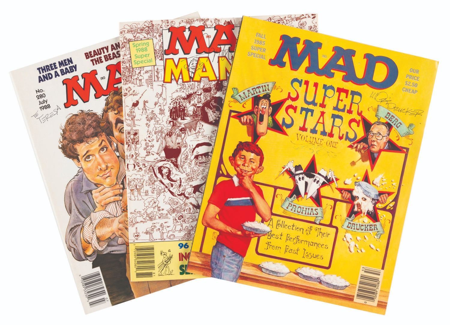 (MAD, 1985-88) Three signed issues of MAD magazine, including issue no. 280 from July 1988 and the Super Special from Fall 1985, both signed by Mort Drucker, and the MAD Mania Super Special from Spring 1988 signed with a sketch by Sergio Aragones. Measuring 8” x 10.5” each, the magazines are in fine condition.