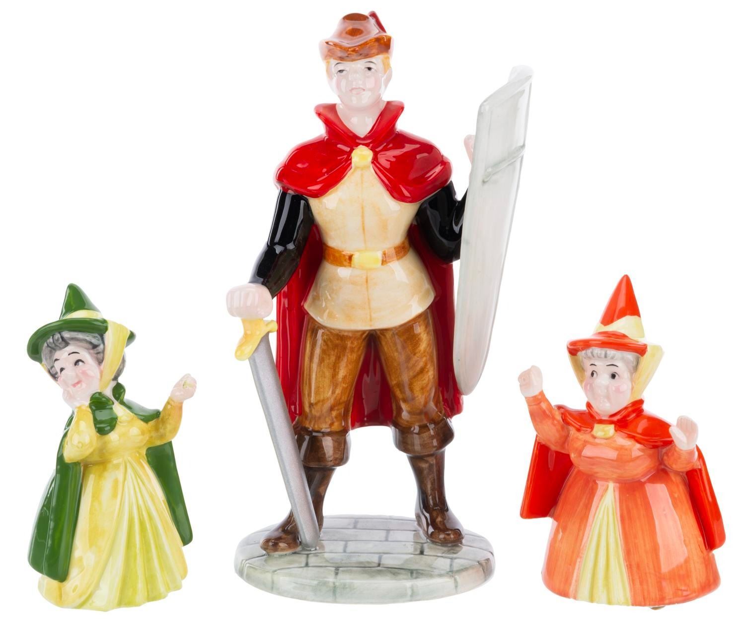 (Schmid, 1989) Three figurines of Prince Phillip, Flora, and Fauna from "Sleeping Beauty" released for the film's 30th anniversary. Ranging in size from 1.75" x 1.75" x 4" to 3" x 3.25" x 7", the ceramic figurines are in fine condition with museum wax and Blu-Tak residue on the underside, which does not affect display.
