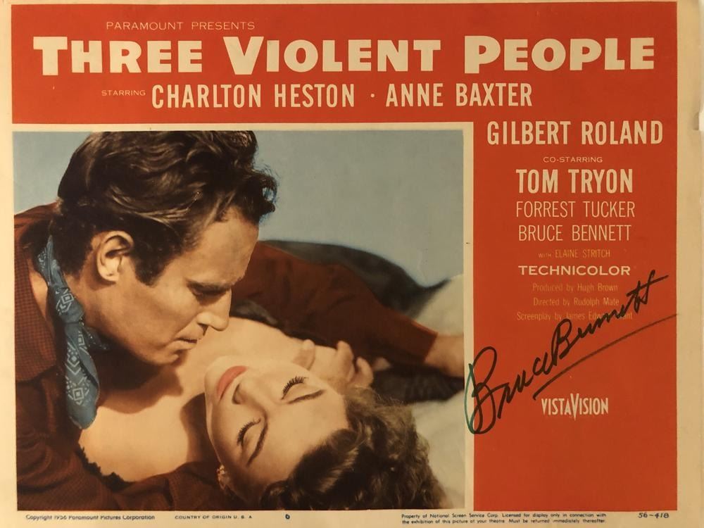 Three Violent People signed lobby card autographed by Bruce Bennett. 11x14 inches.