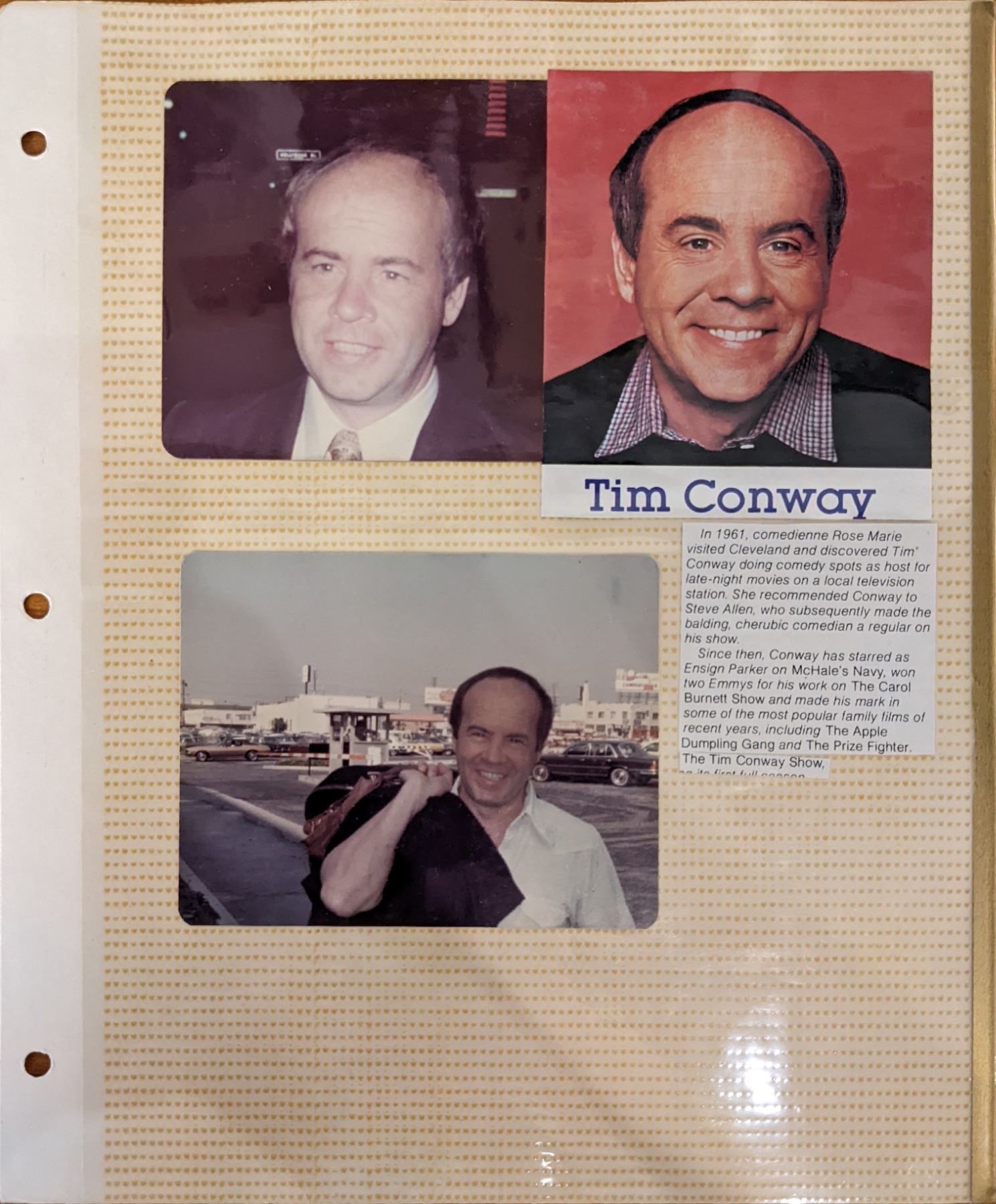 Tim Conway Original Photo Album Page. From backstage at the Merv Griffin Show. 1980's. 9x11 inches. All of these pictures were taken backstage and are one of a kind photos with no copies made