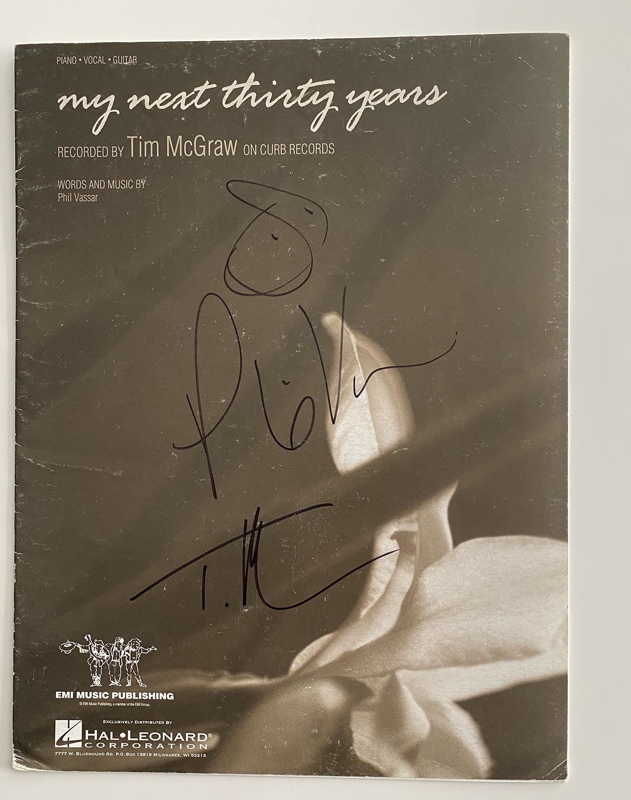 My Next Thirty Years Tim McGraw and Phil Vassar signed sheet music.JSA authenticated.9x12 inches