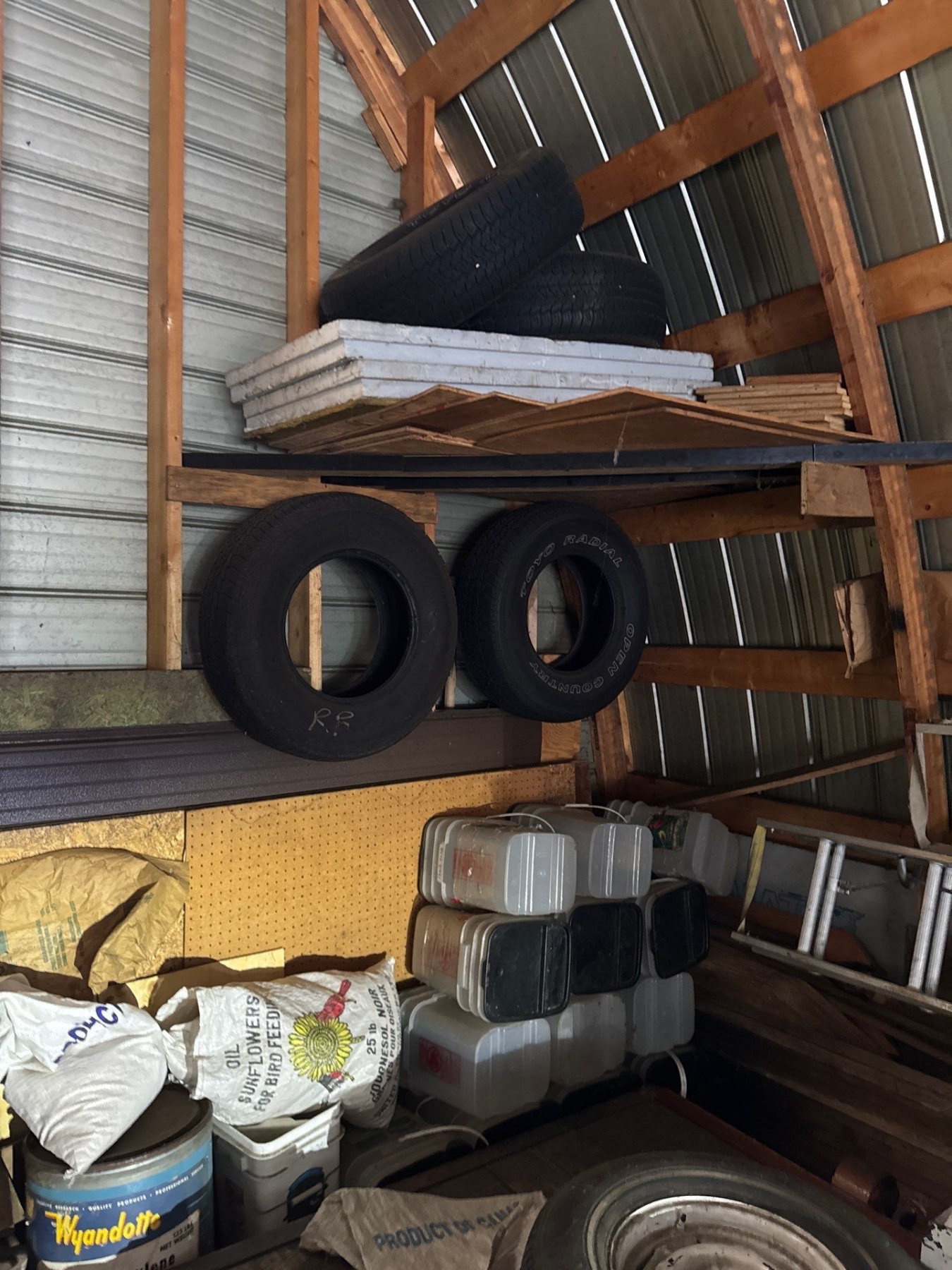 Tires, storage boxes, wood shavings, buckets, all items in corner included.