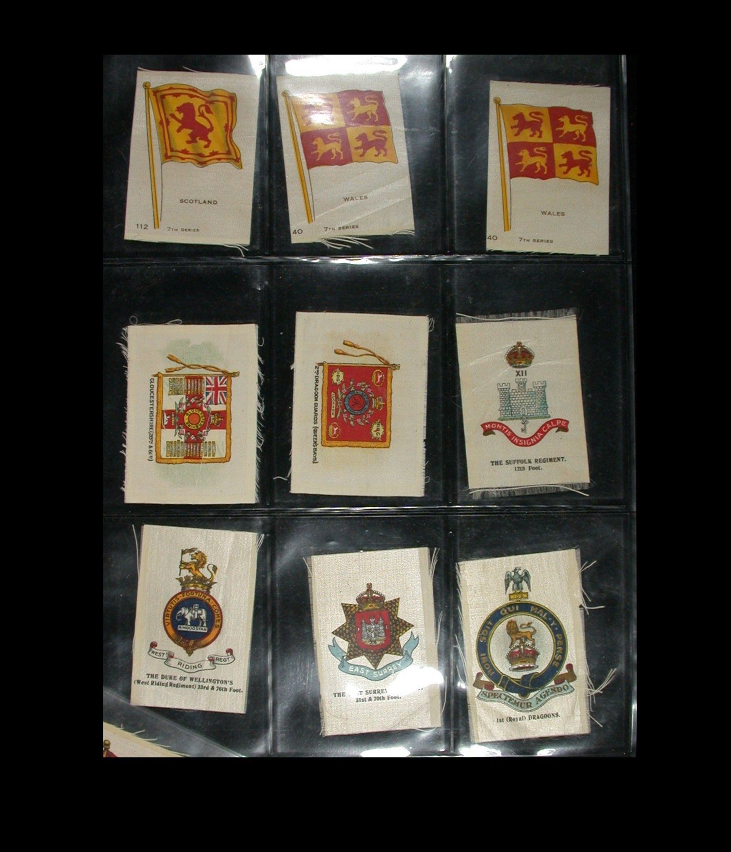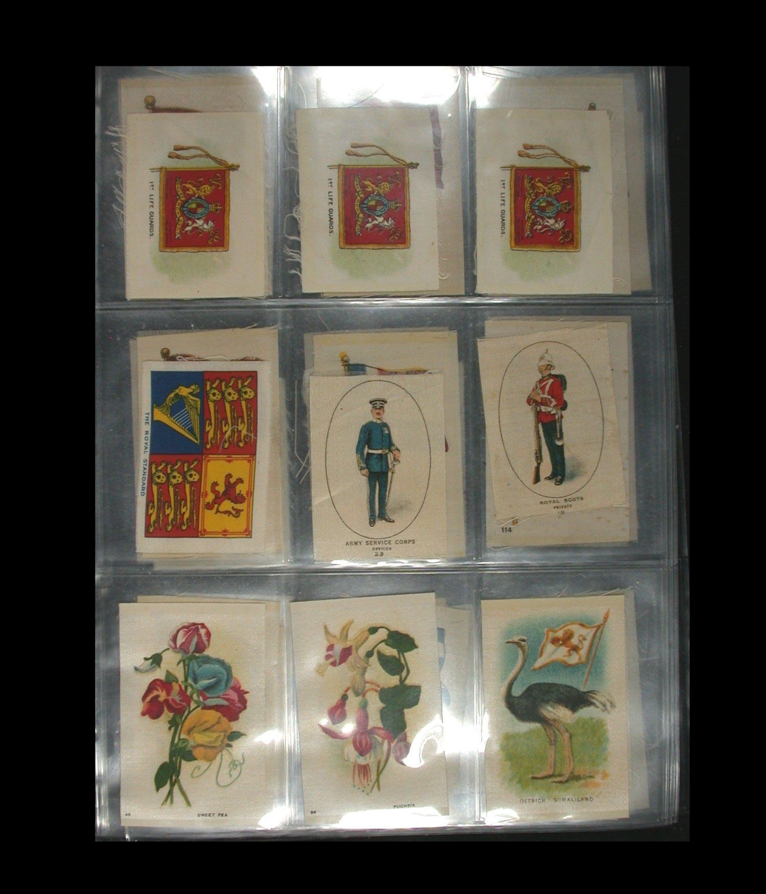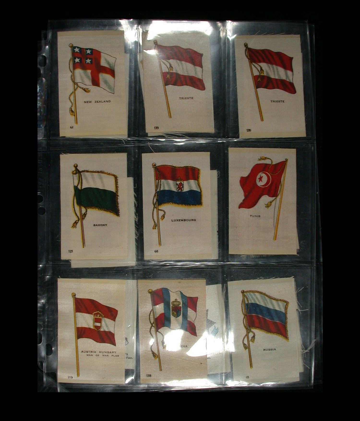 A mixed lot of 63 Cigarette "Silks", quite early 1900's, various makers and including National Flags, Regimental Crests, National Flags & Animals, etc. All on uniface white silk, and a nice starter lot for this interesting field of collecting (Lot of 63 silks).