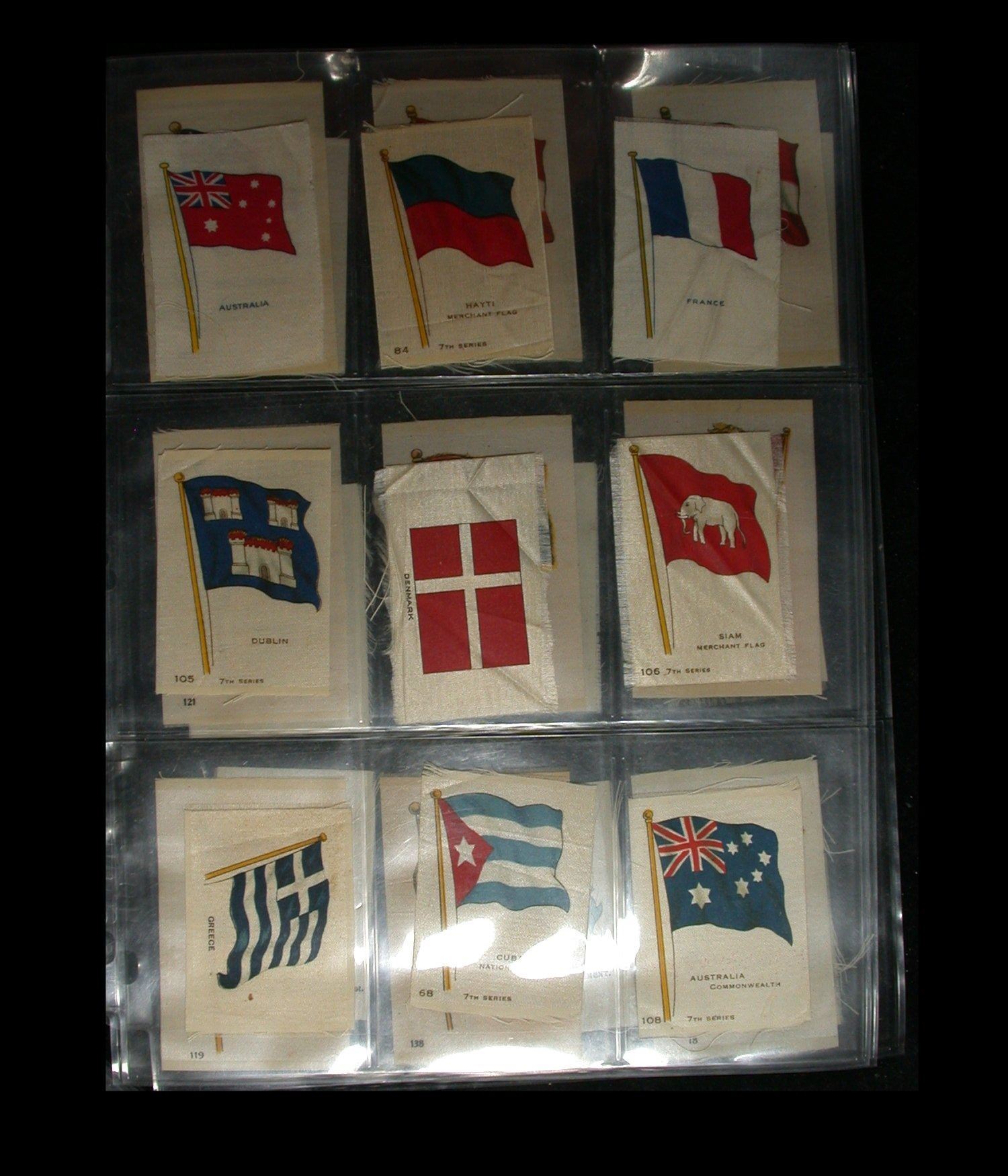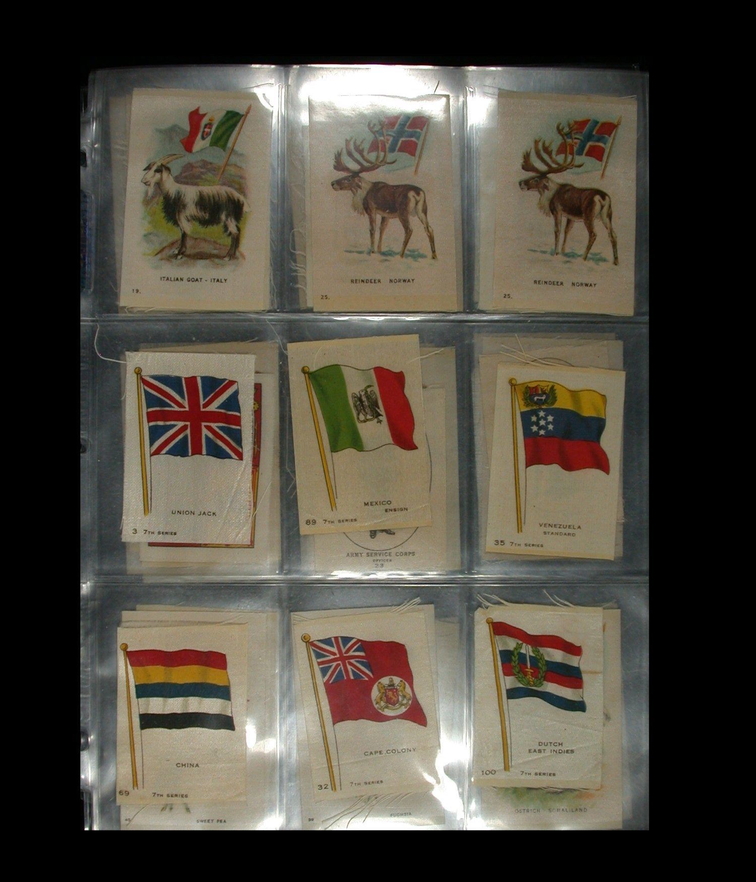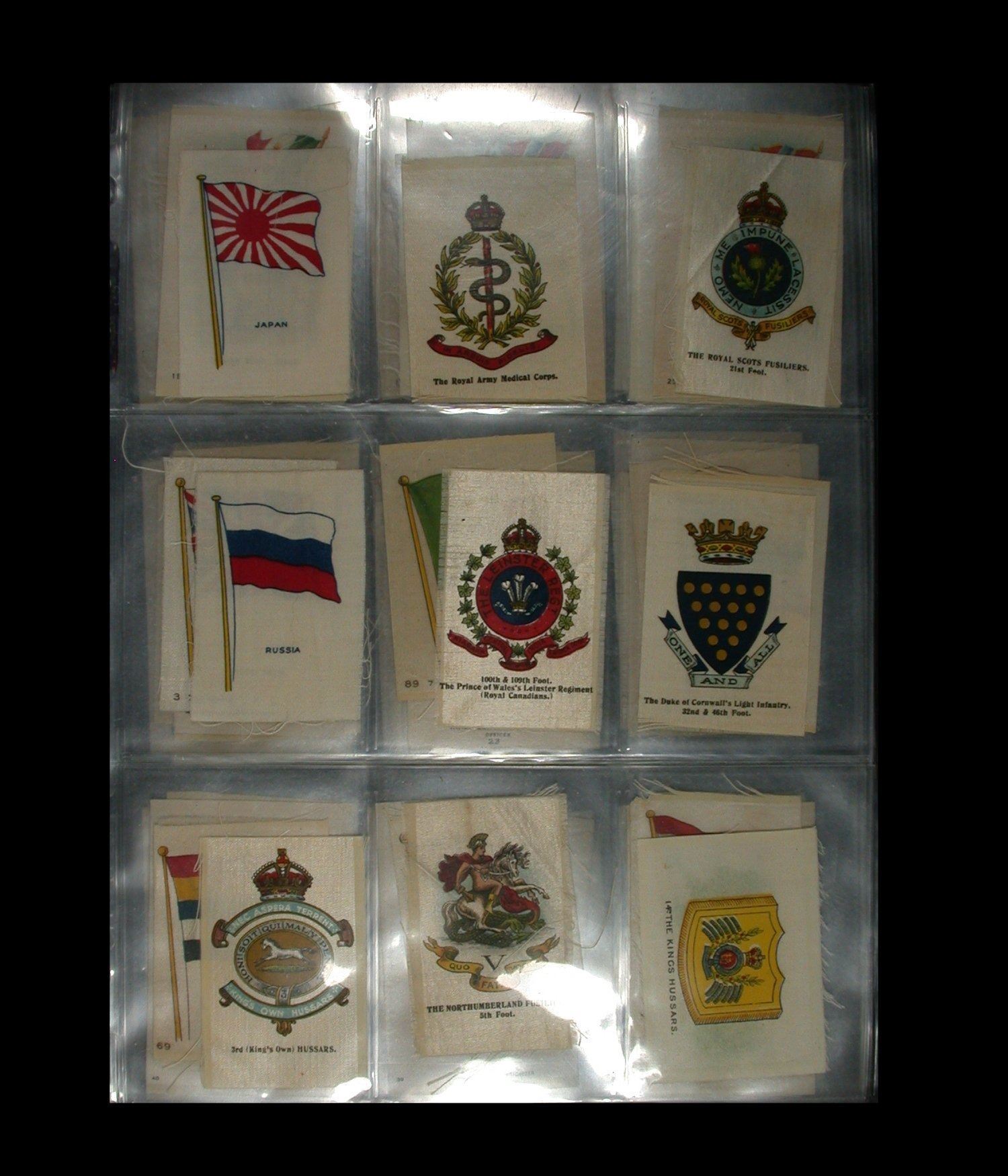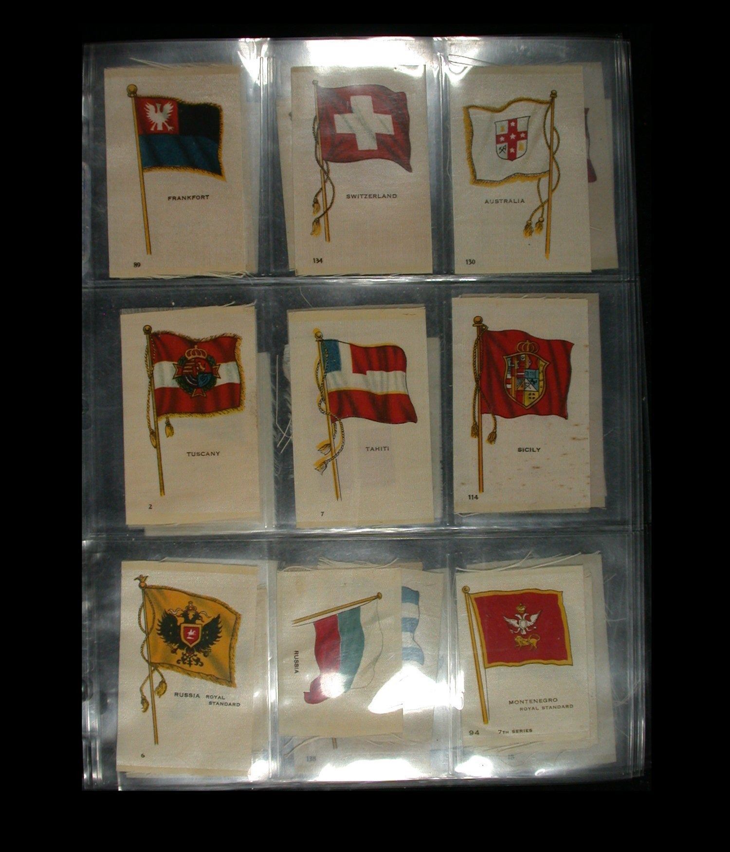A mixed lot of 63 Cigarette "Silks", quite early 1900's, various makers and including National Flags, Regimental Crests, National Flags & Animals, etc. All on uniface white silk, and a nice starter lot for this interesting field of collecting (Lot of 63 silks).