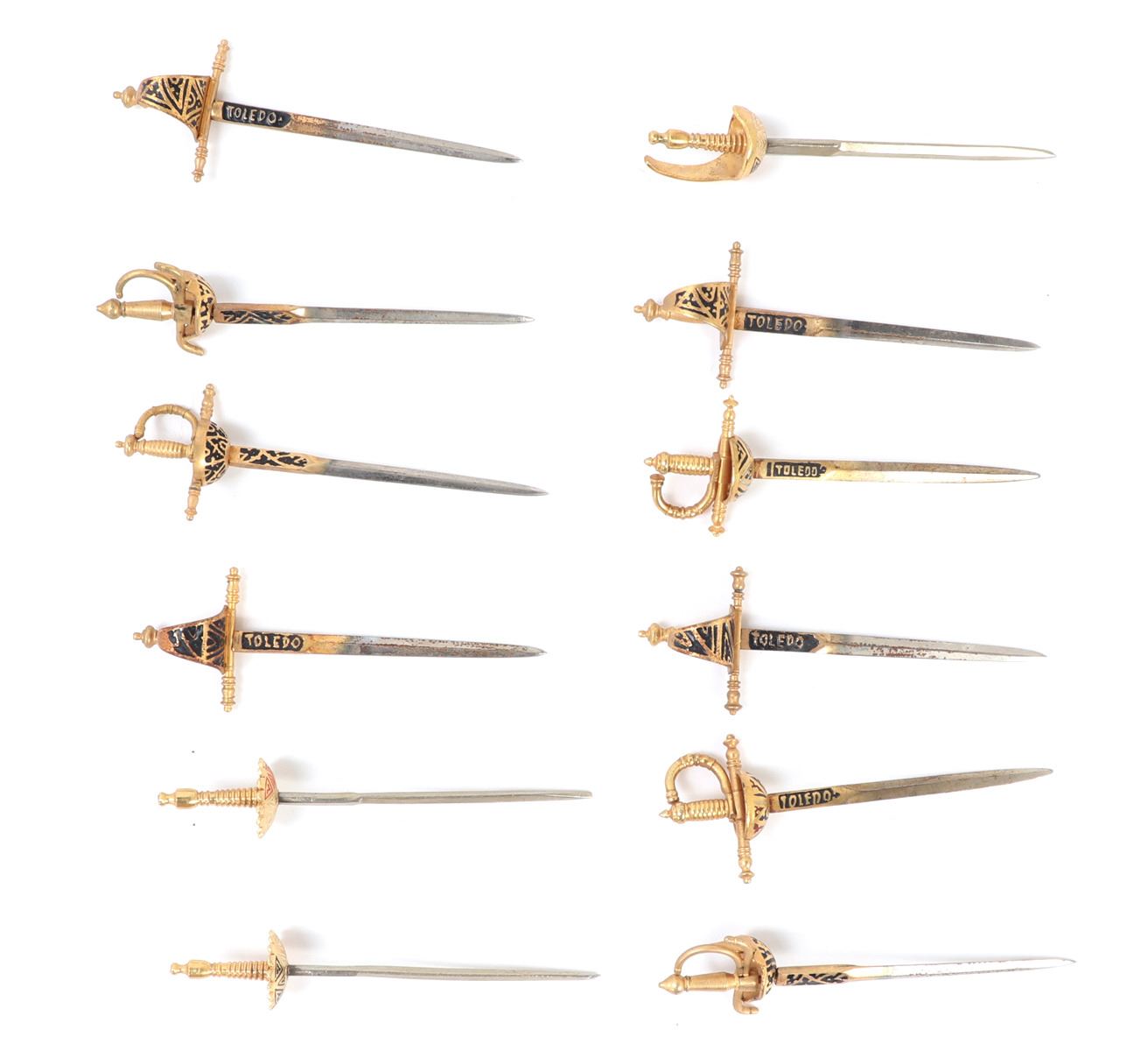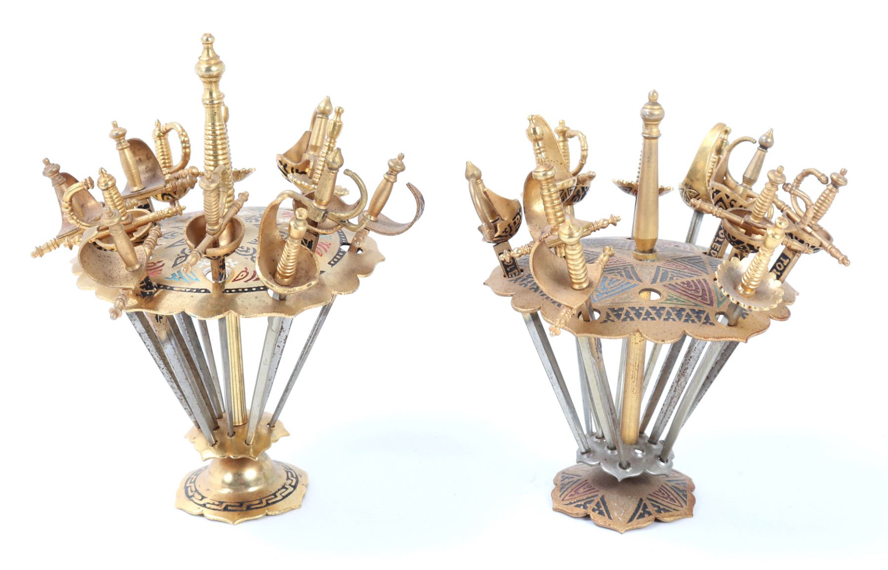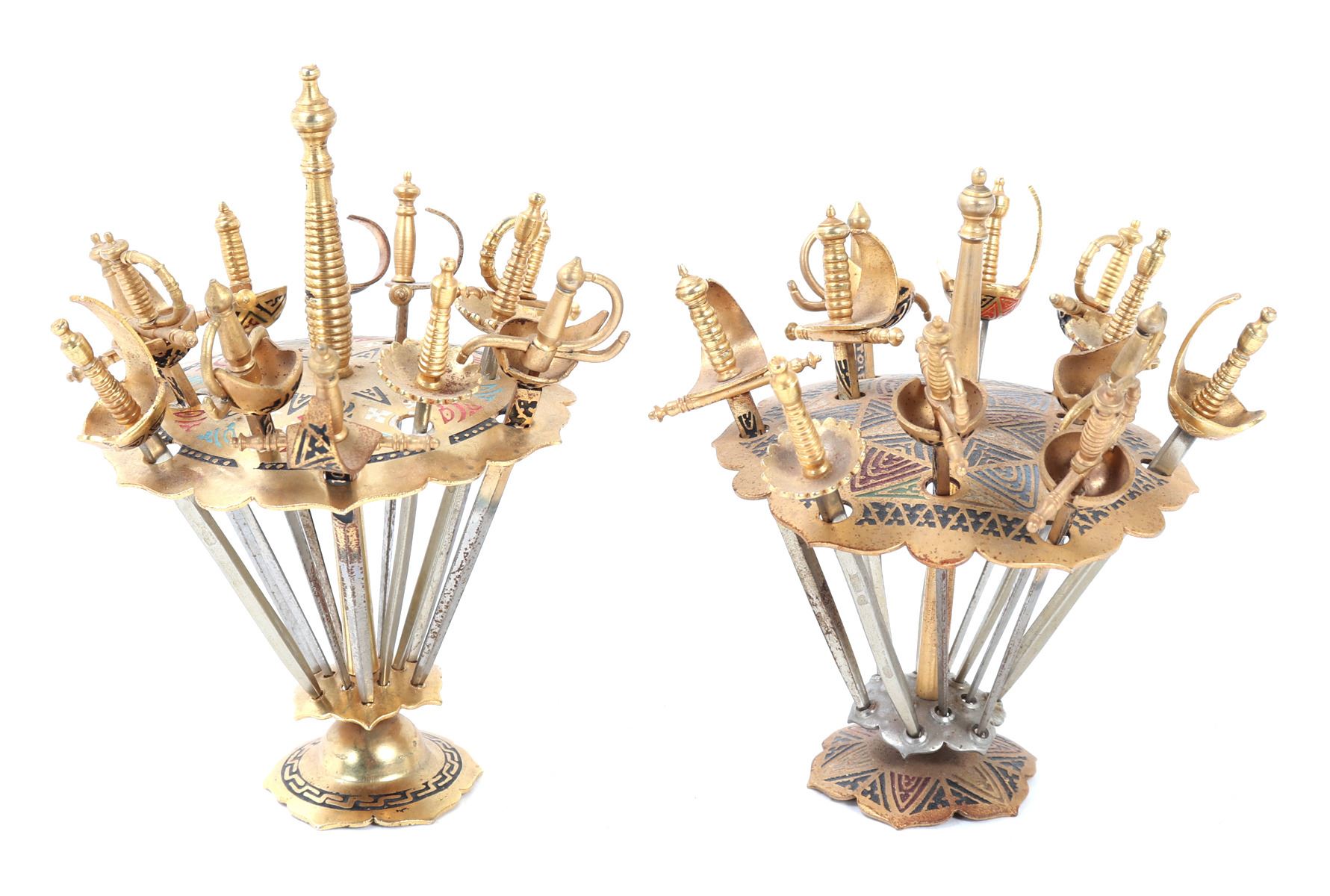 Toledo Damascene cocktail sword set with each piece with gold and silver threads against a blackened steel background in the style of Toledo, Spain. The set includes beautifully crafted miniature swords arranged in a decorative holder, making it both a functional bar accessory and a conversation starter. Size 4 1/4" H. Provenance: Ex-Southern California Collection