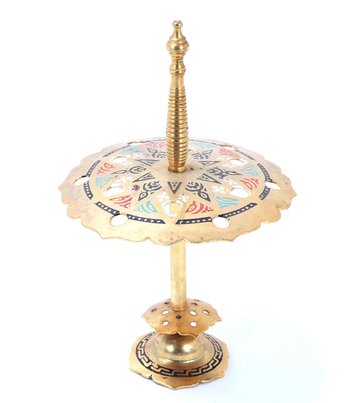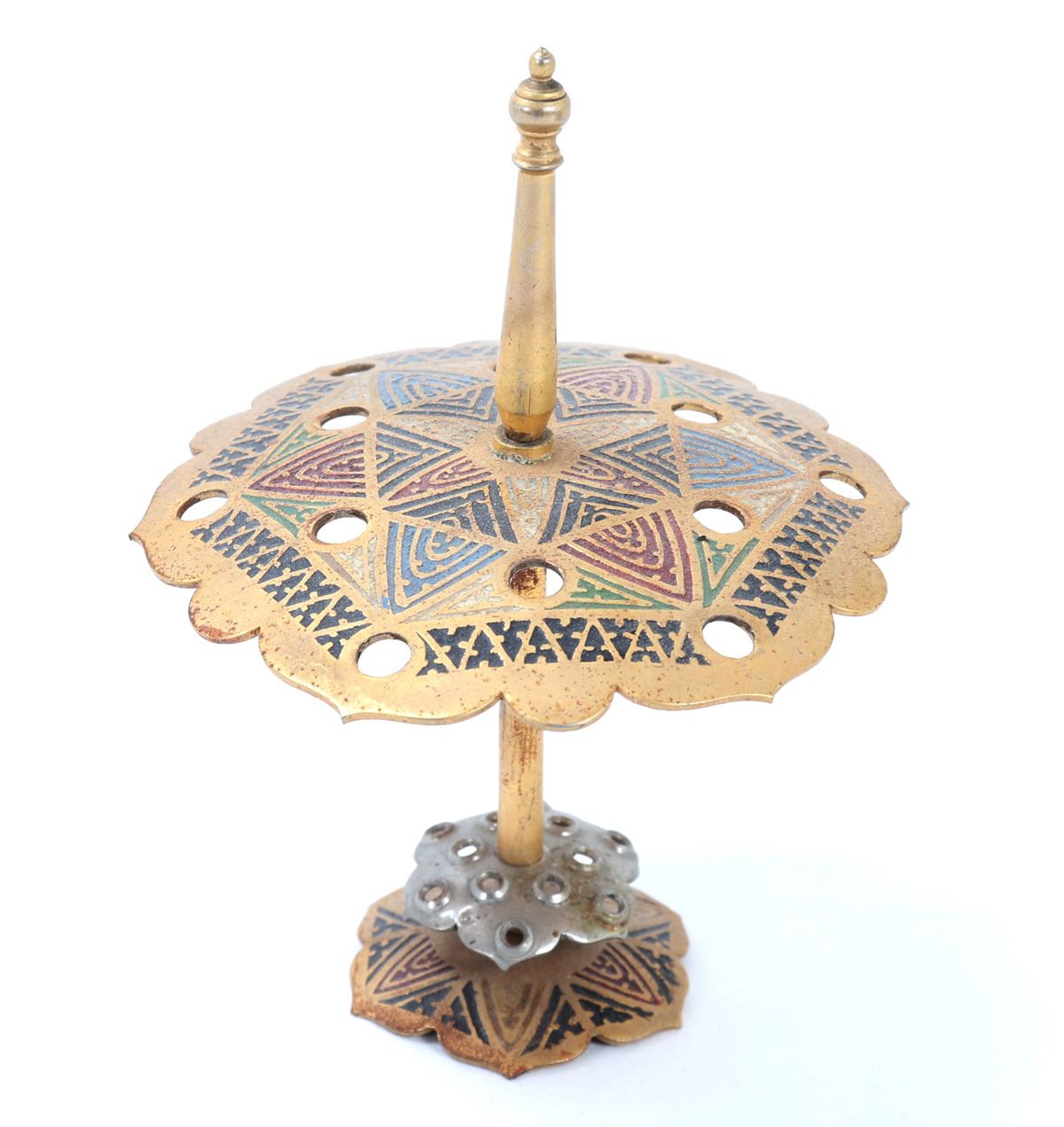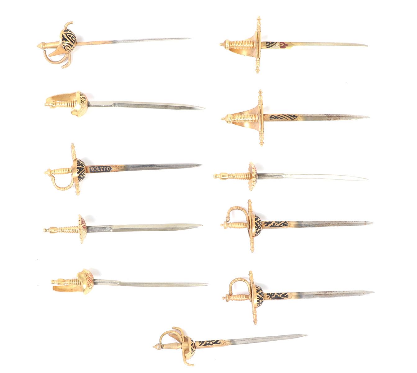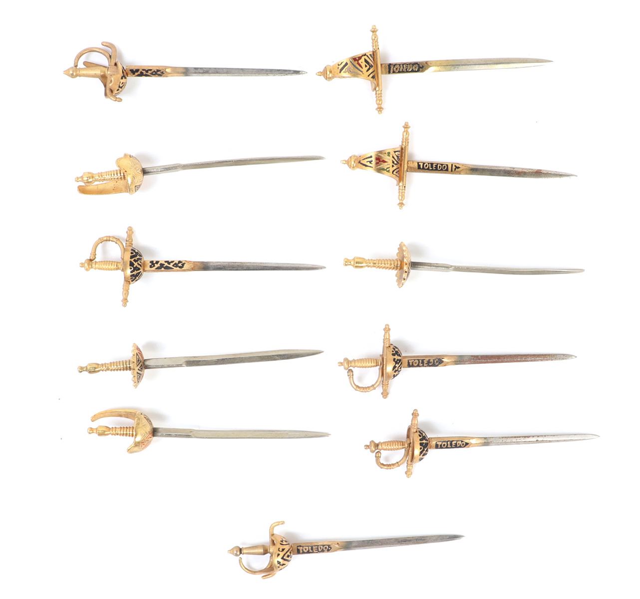 Toledo Damascene cocktail sword set with each piece with gold and silver threads against a blackened steel background in the style of Toledo, Spain. The set includes beautifully crafted miniature swords arranged in a decorative holder, making it both a functional bar accessory and a conversation starter. Size 4 1/4" H. Provenance: Ex-Southern California Collection