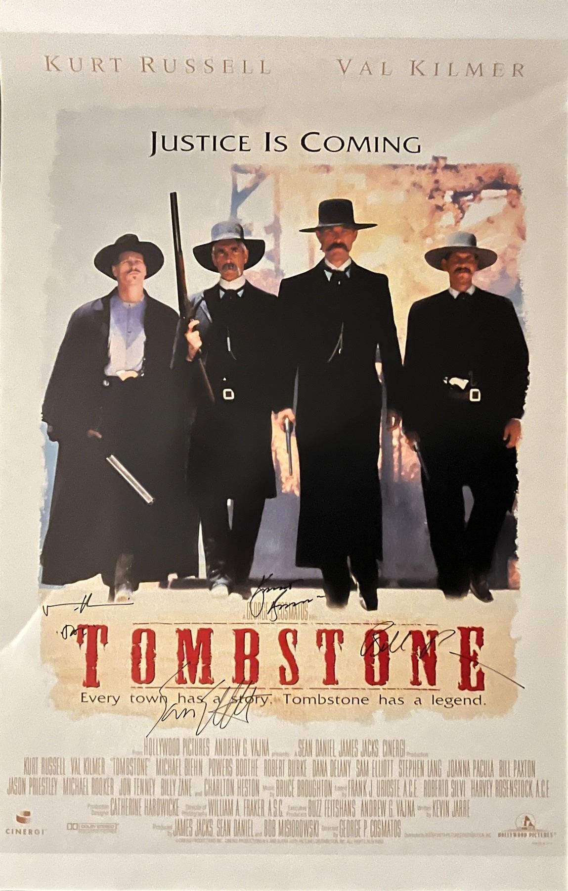 Tombstone cast signed movie poster autographed by Kurt Russell, Val Kilmer, Sam Elliott and Bill Paxton. 24x37 inches
