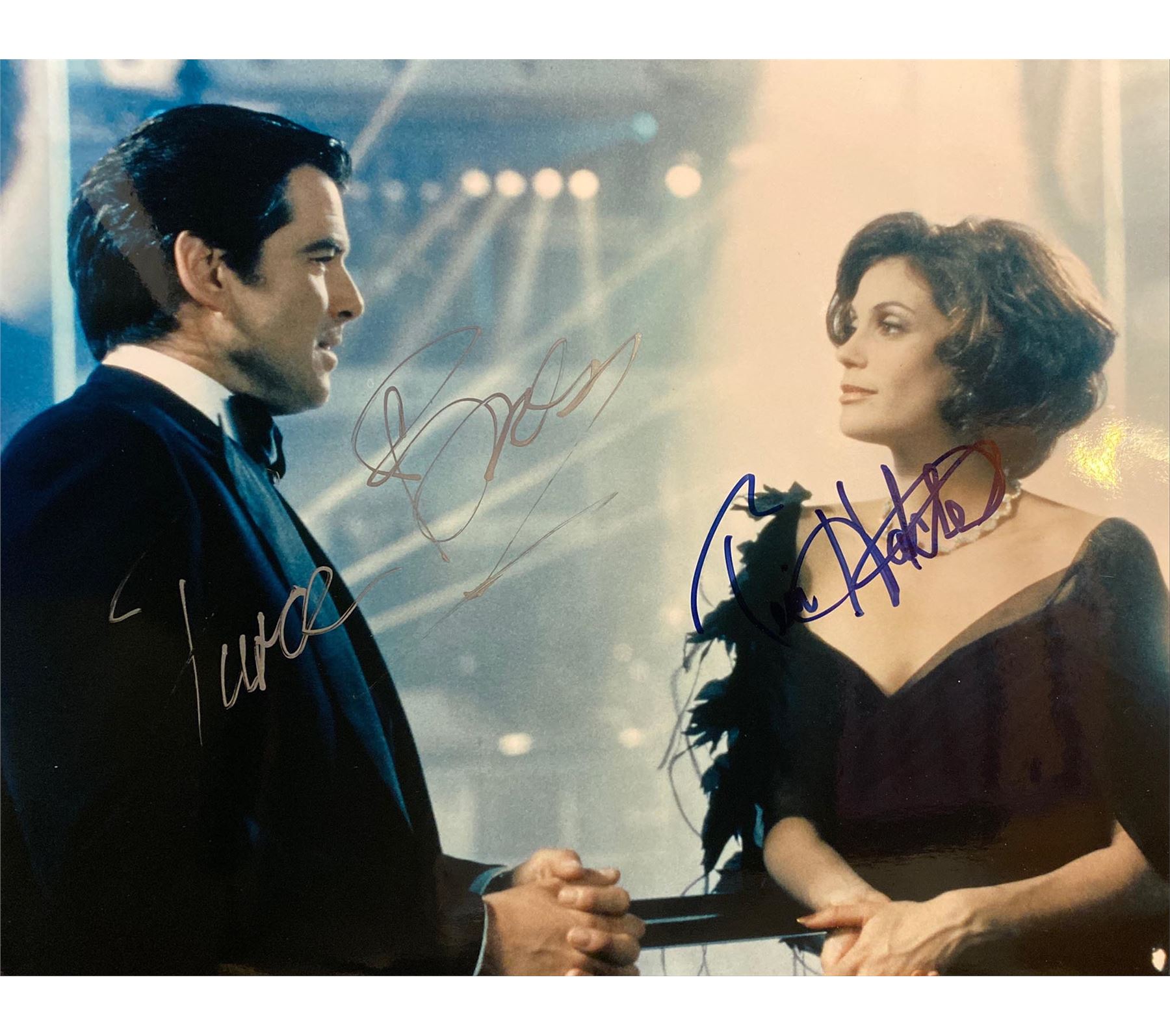 Tomorrow Never Dies signed movie photo autographed by Pierce Brosnan and Teri Hatcher. 8x10 inches