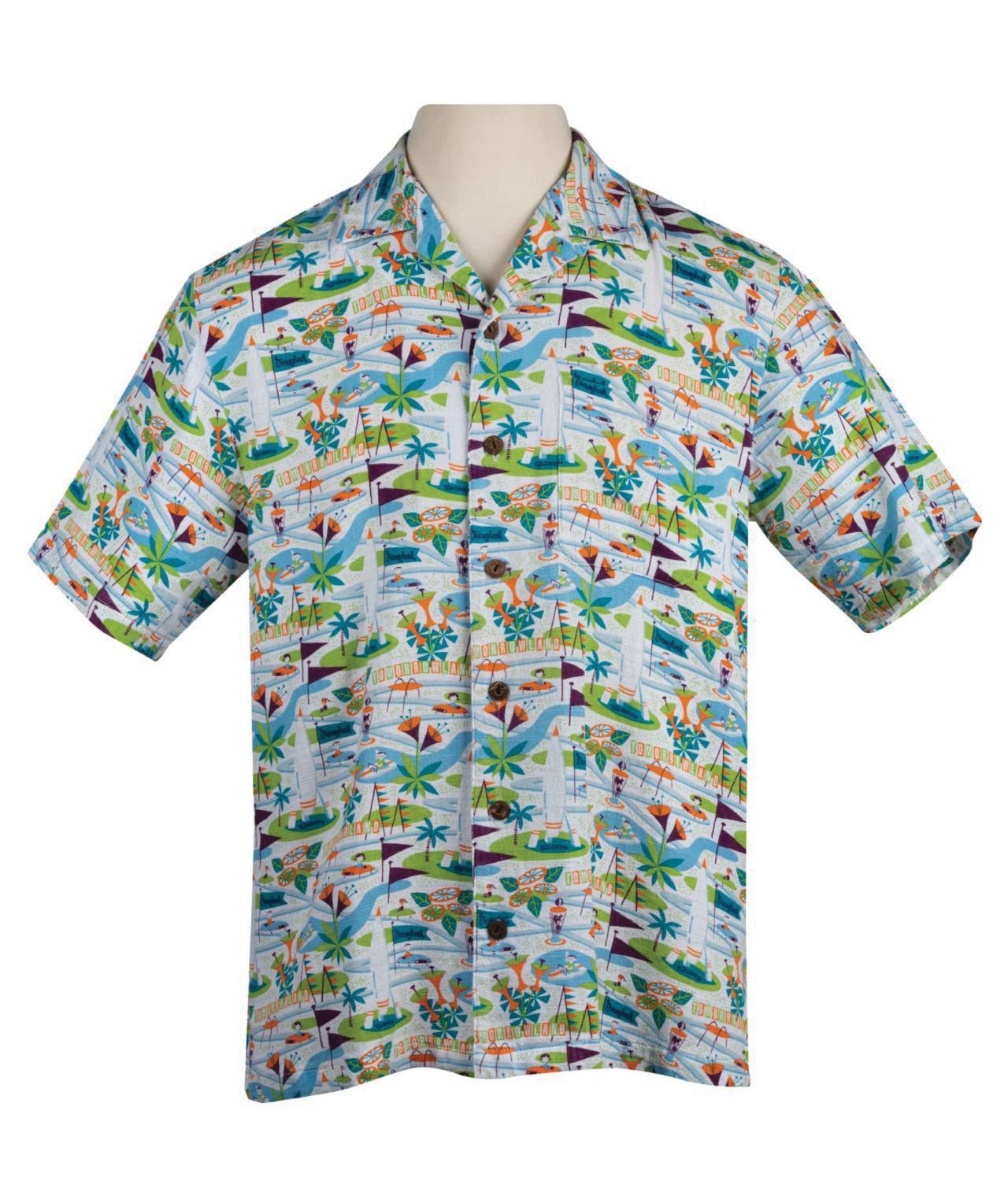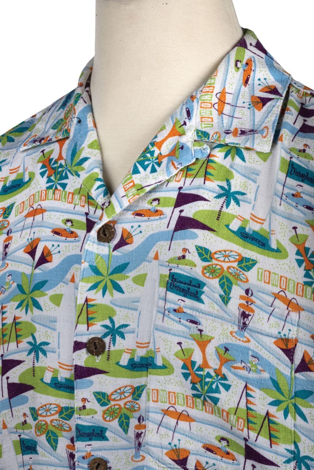 (Disneyland, 2005) A limited edition Tomorrowland aloha shirt by Shag. Autopia drivers and Motorboat pilots speed through the highways, byways, and waterways of Tomorrowland on this limited edition shirt produced by Shag, for the 50th anniversary of Disneyland in 2005. Measuring a size large, the quality cotton shirt with wood buttons was produced to an edition of 500, and is in very good condition with minor wear. One eyelet has unthreaded, making it difficult to fasten that button.