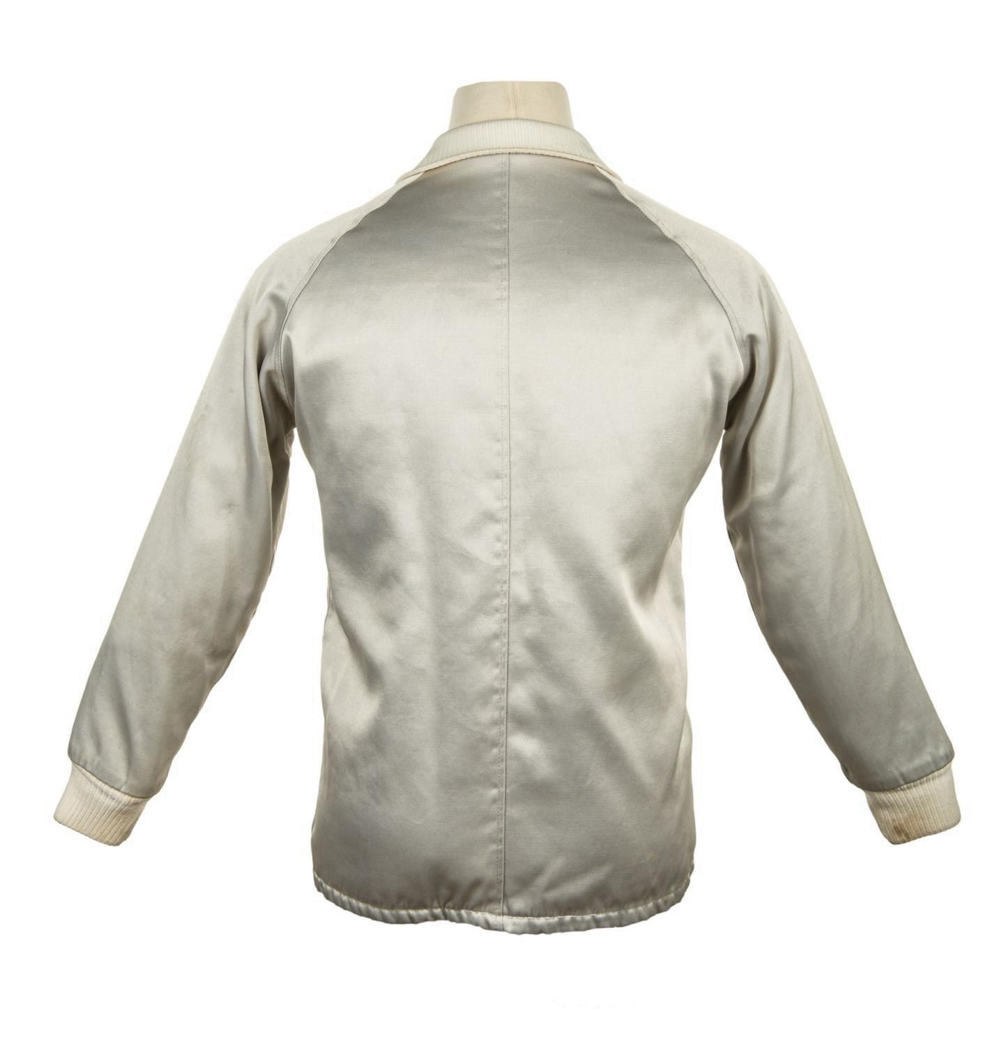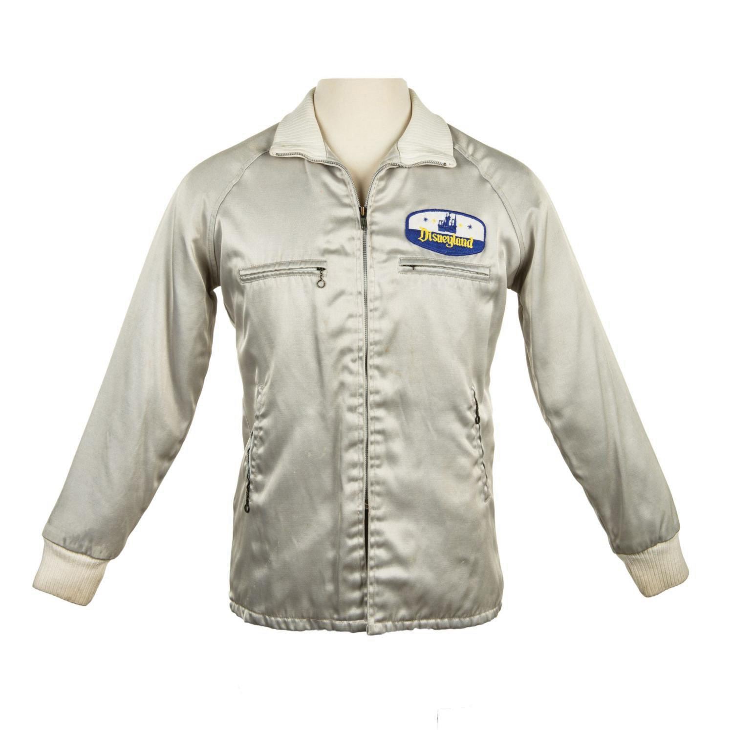 (Disneyland, c.1980s) An original Cast Member jacket used in Tomorrowland. The jacket features the shimmering silver and white design used throughout Tomorrowland in the 1980s and 1990s. A Disneyland patch is displayed on the chest, as well as a Wardrobe Department label inside the neck. The jacket is marked in felt pen as a size M and is in good overall condition with some wear from use.