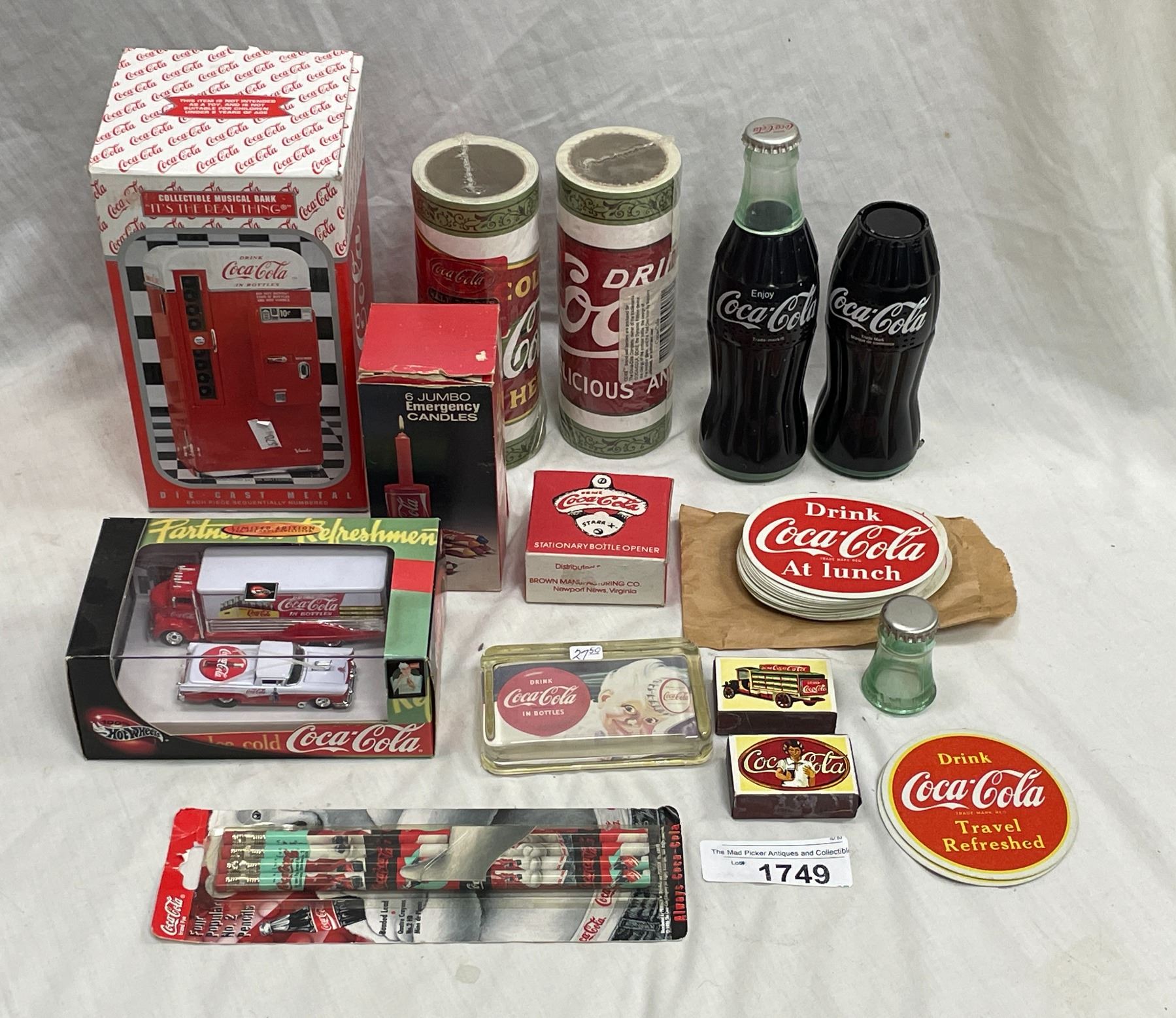 Tote Full Of Coca Cola Collectibles, Musical Bank, Coasters, Candle Holder, Etc…