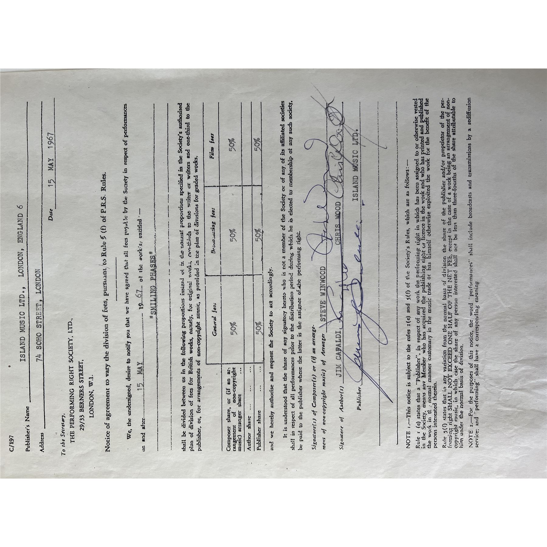 Traffic signed Island Music LTD contract autograph by Chris Wood, Jim Capaldi, and Steve Winwood. May 15, 1967. 9x12 inches
