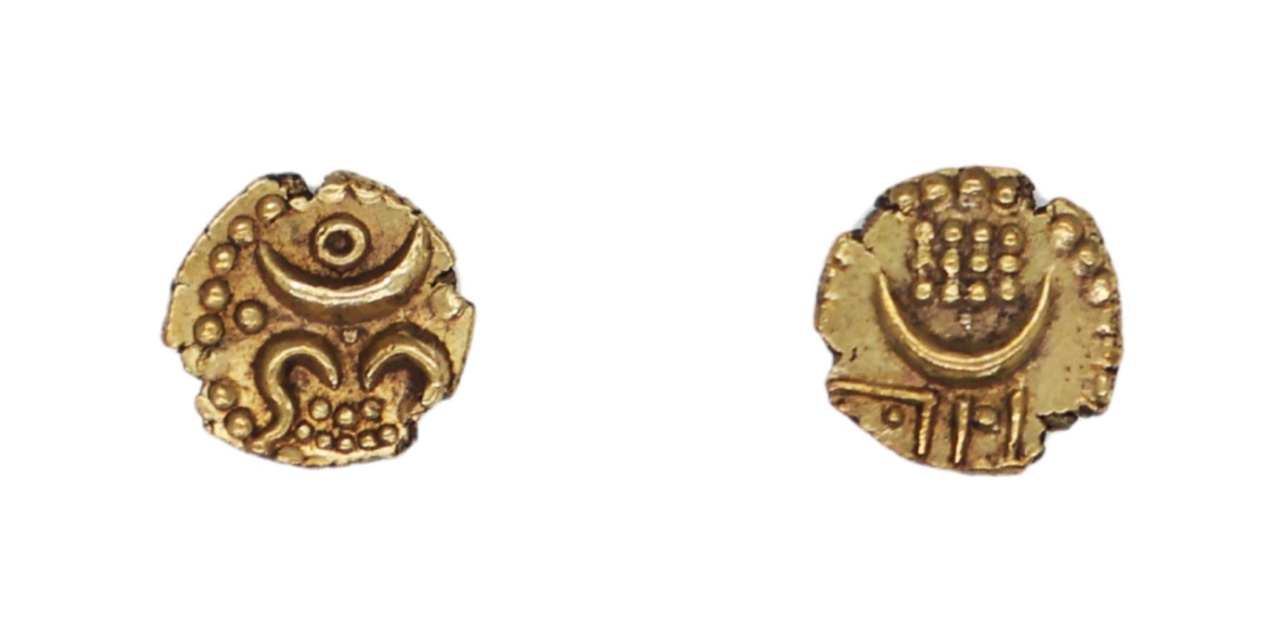 Travancore, Bala Rama Varma I (ME 973-986 / 1798-1810 AD), Gold Anantaraya Fanam, 0.36g, 6.76mm, Obv: Crescent above circle and two curved lines and pellets below, Rev: Large crescent above 12 pellets below design. (KM # 3).Very Fine. Scarce.