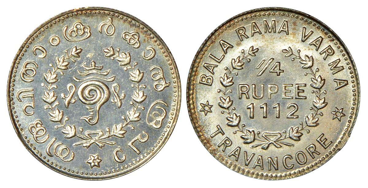 Travancore, Bala Rama Varma II (1924-1949 AD), silver ¼ rupee, ME 1112, KM 62, 2.67g. Obv: Conch shell in sprays. Rev: Value and date within wreath, initial B.R.V. of Bala Rama Varma engraved on rim.