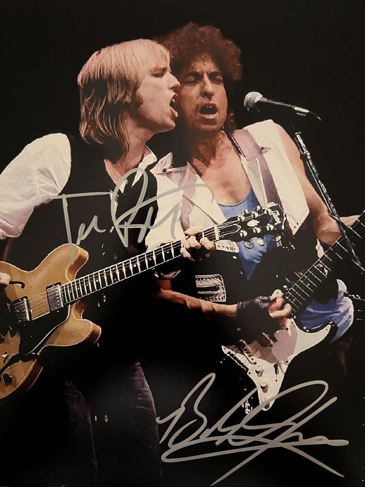 Traveling Wilburys band signed photo autographed by Tom Petty and Bob Dylan. 8x10 inches