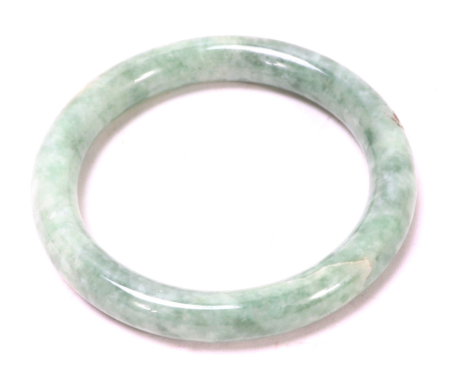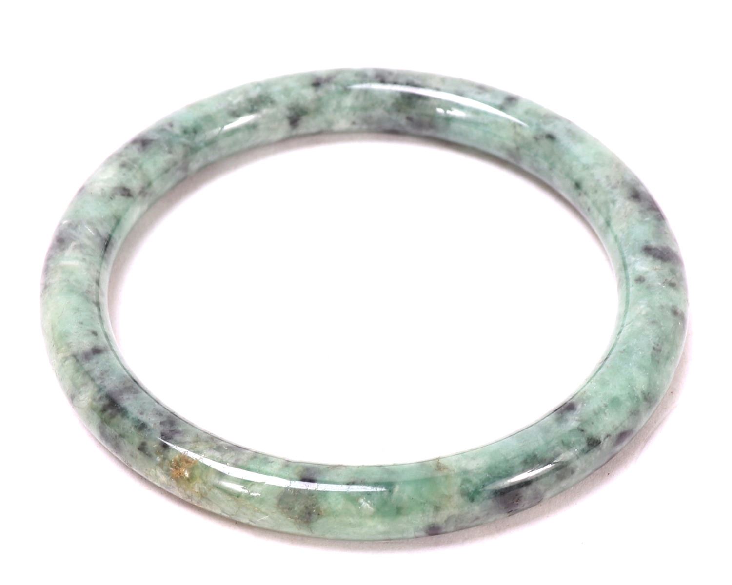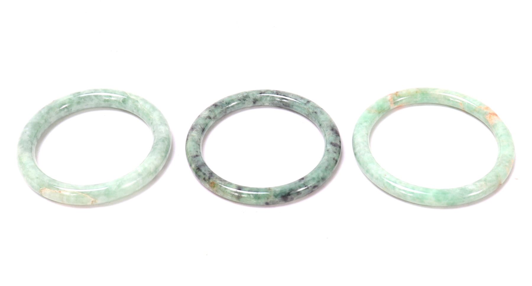 Three beautiful Chinese stone carved and polished bangle bracelets. Each with a unique green marbling color throughout. Size of each 2 1/2" OD, 2" ID, Weight 23 g, 24 g, 33 g, $75. Condition: Wonderful wearable condition throughout.