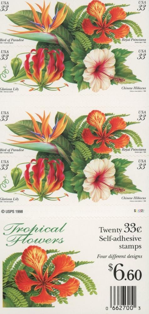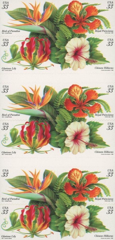 20 x 33¢ Tropical Flowers U.S. #3310-13. Illustrated by botanical artist Steve Buchanan. Created as a single piece of art, the stamps form a continuous design. Featuring the bird of paradise flower, royal poinciana and gloriosa lily.
