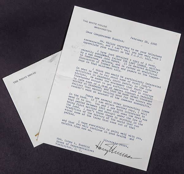 Truman, Harry S. Typed letter signed as President on The White House / Washington letterhead, 1 page, 7 x 8� in., 25 Feb. 1950. To Congressman Usher L. Burdick of North Dakota, discussing a book called The Last Chance, by John Myers, about Tombstone, Arizona and "the happenings in that wild-west city." He writes, in part: "I think you would be particularly interested in what he has to say about some of Wyatt Earp's activities in Deadwood, South Dakota, in the late sixties.Wyatt was forehanded enough to get sufficient feed in storage to take care of a team of horses through a terrible winter at Deadwood, and that he made seven thousand dollars that winter hauling wood for the miners who couldn't work on account of the immense snowdrifts.You and I are both interested in that period between 1865 and 1890 when the West was being first settled and brought under the law of the land. I don't think there is anything in the traditions of the history of the world that can equal some of the tales that come out of that period" Very fine. An unusual letter reflecting President Truman's personal interests.