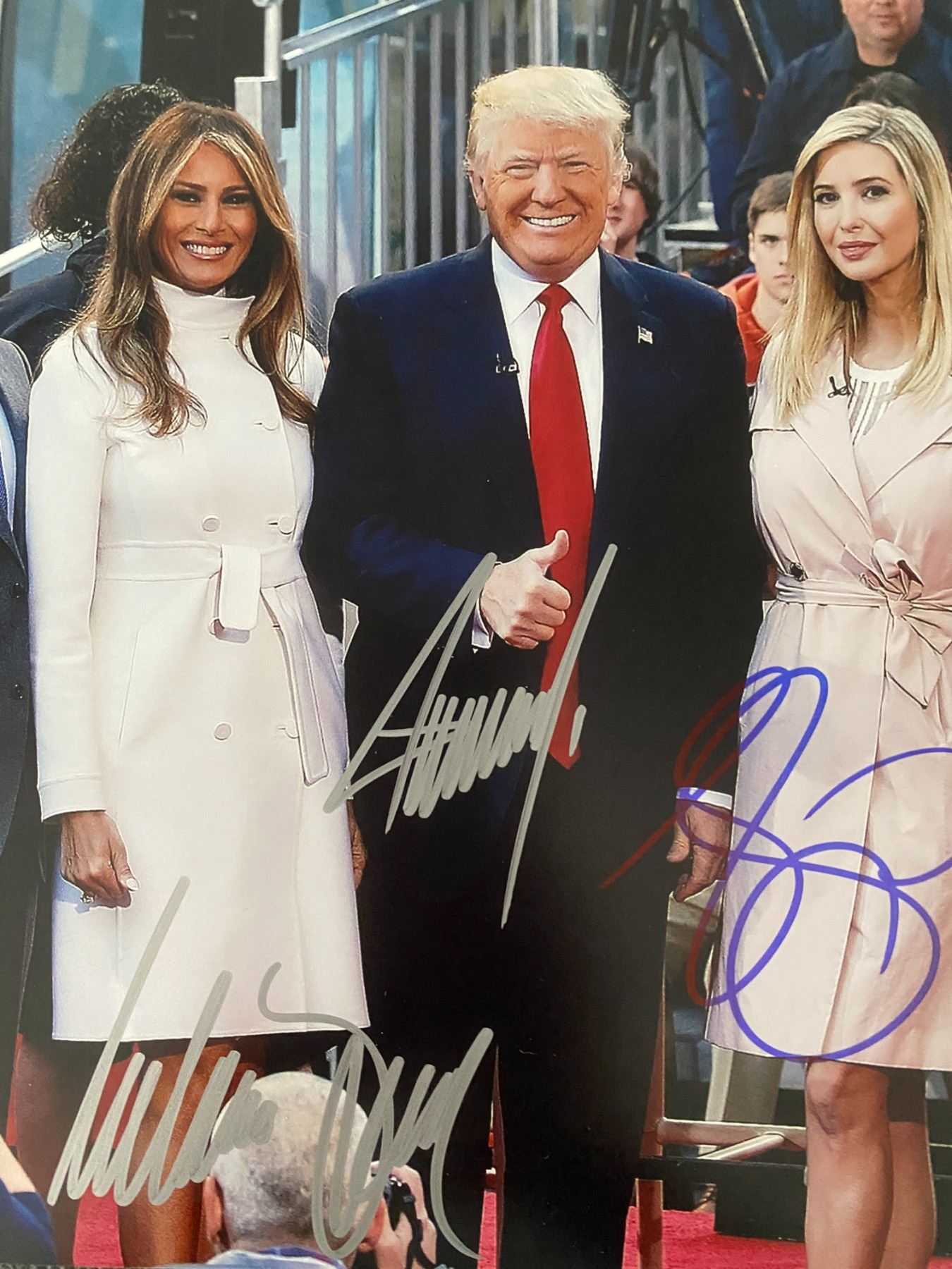 Trump family photo autographed by Donald Trump, Melania Trump and Ivanka Trump. 8x10 inches