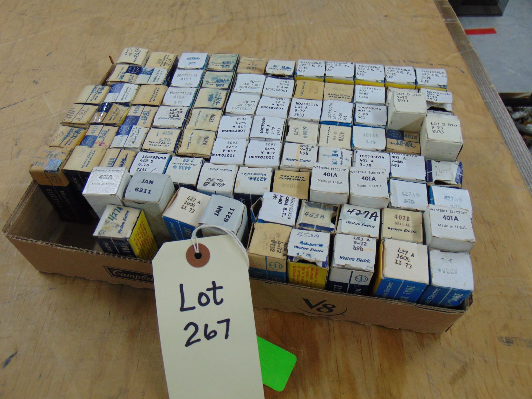 The auction company has made a sampling of the marked tube boxes in an attempt to verify that the tube number marked on the box top is indeed the tube inside the box. However, as every tube box has not been checked, the auctioneer does not guarantee all tube boxes are correctly marked. Again, if you have specific requests to verify type and/or quality of tube, specifics concerning any listed item, contact the auctioneer directly at the number given elsewhere.