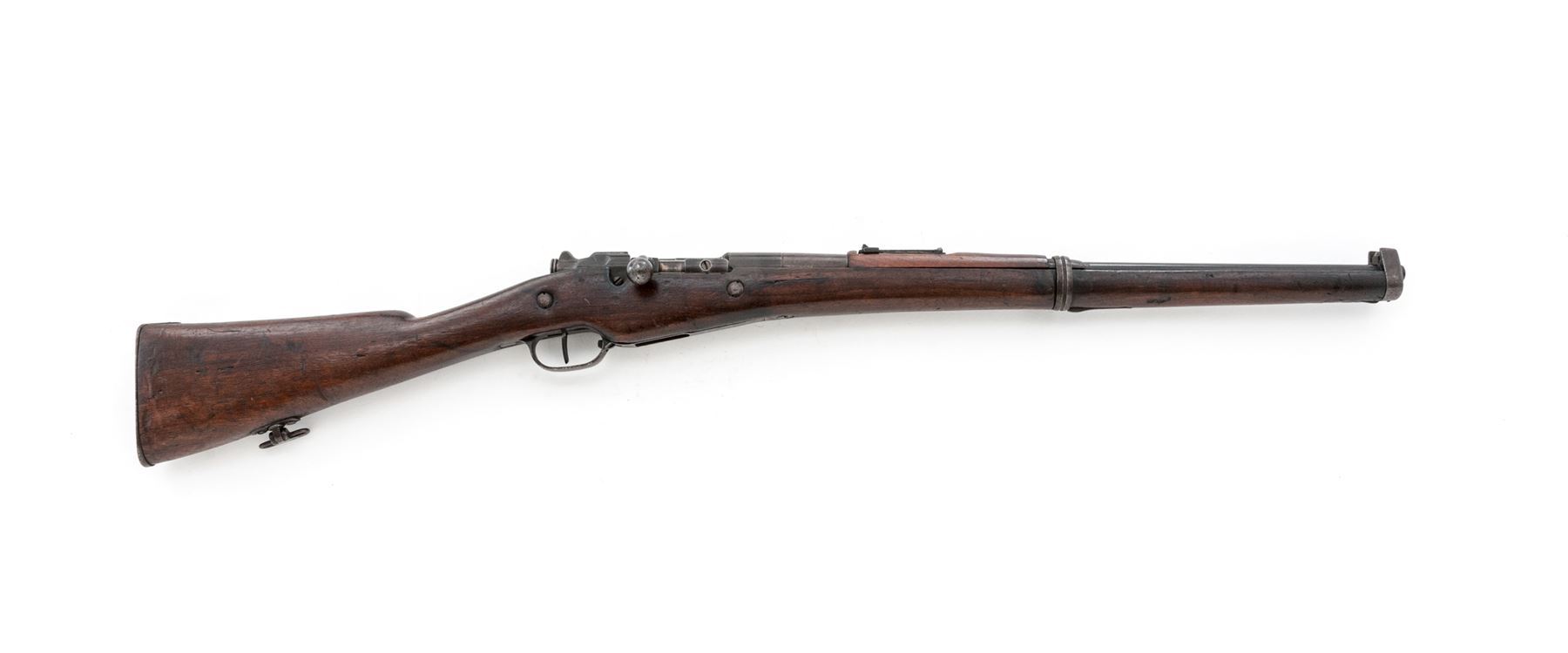 Turkish Forestry Bolt Action Carbine, #4732, 8x50R Lebel cal., 22'' barrel, blued finish, hardwood stock, inverted ''V'' front sight with protectors and folding leaf rear sight. Marked on left side of receiver with original French ''St.Etienne MLE 1907_15'', and on top of receiver ring with Turkish conversion ''T.C. ORMAN 1948''. Bolt has been re-numbered to match. Condition overall is good with approx. 30% finish remaining on the metal with patina throughout. There is a piece of the hand guard missing at the barrel band, otherwise the wood is very good with darkening and handling marks. Action is smooth, bore is fair with darkening in the grooves and fair rifling. No visible import stamps. Est.: $300-$500. (C&R)
