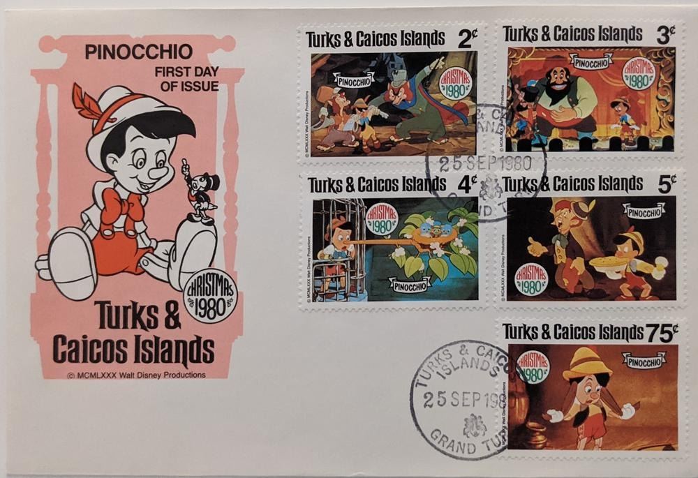 Turks & Caicos Pinocchio Souvenir First Day Cover. 25th September 1980