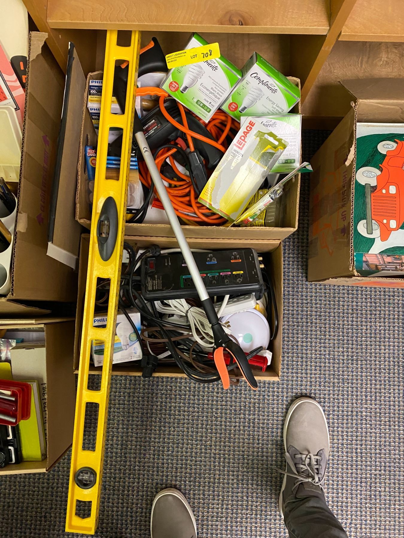 Two Boxes of Misc. Household items including extension cords, power bars, levels and light bulbs