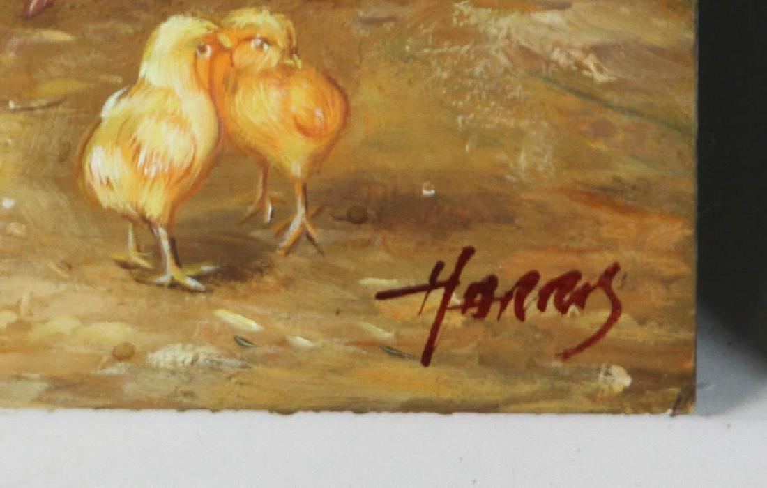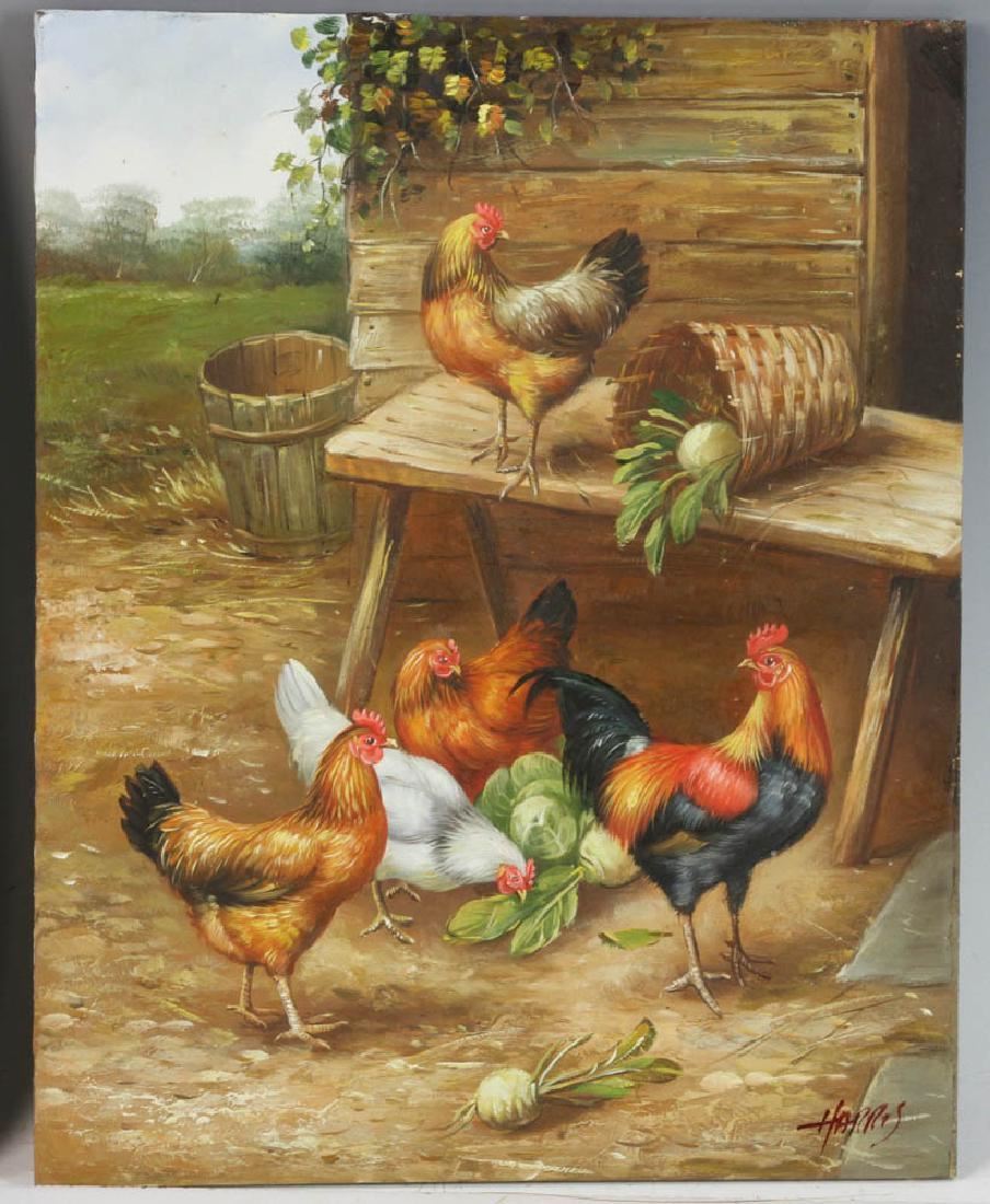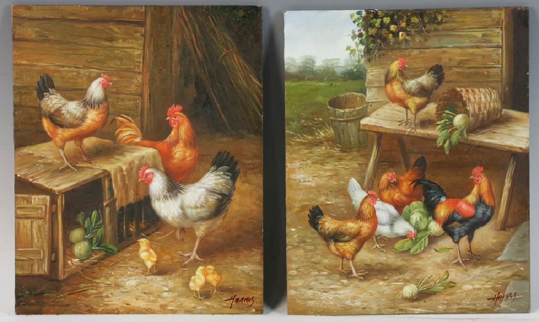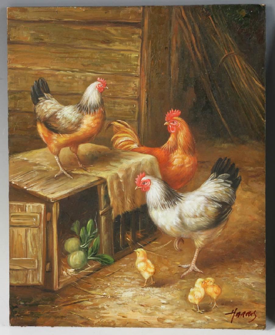 Harris, hens and roosters, oil on board, signed, two in total, framed 10" x 8" Provenance: Boyton Beach, Florida estate.