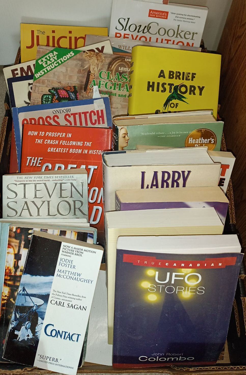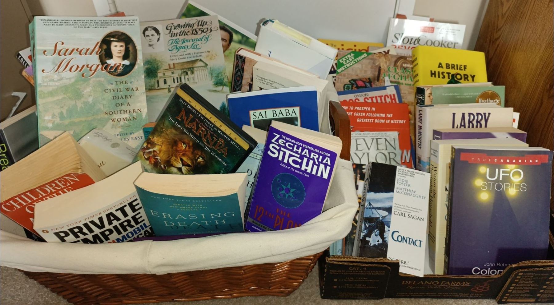 Two Large Stacked Fully Loaded Baskets Of Books For Any Interest