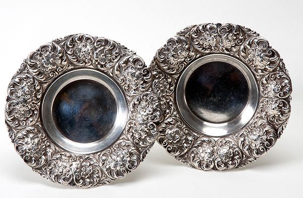 Two Sterling Nut Trays. These lovely matching pieces measure 6�"in diameter, and are adorned with an elaborate floral design. Produced by Hamilton & Diesinger(1881-1899). Total weight is 8.3 oz.